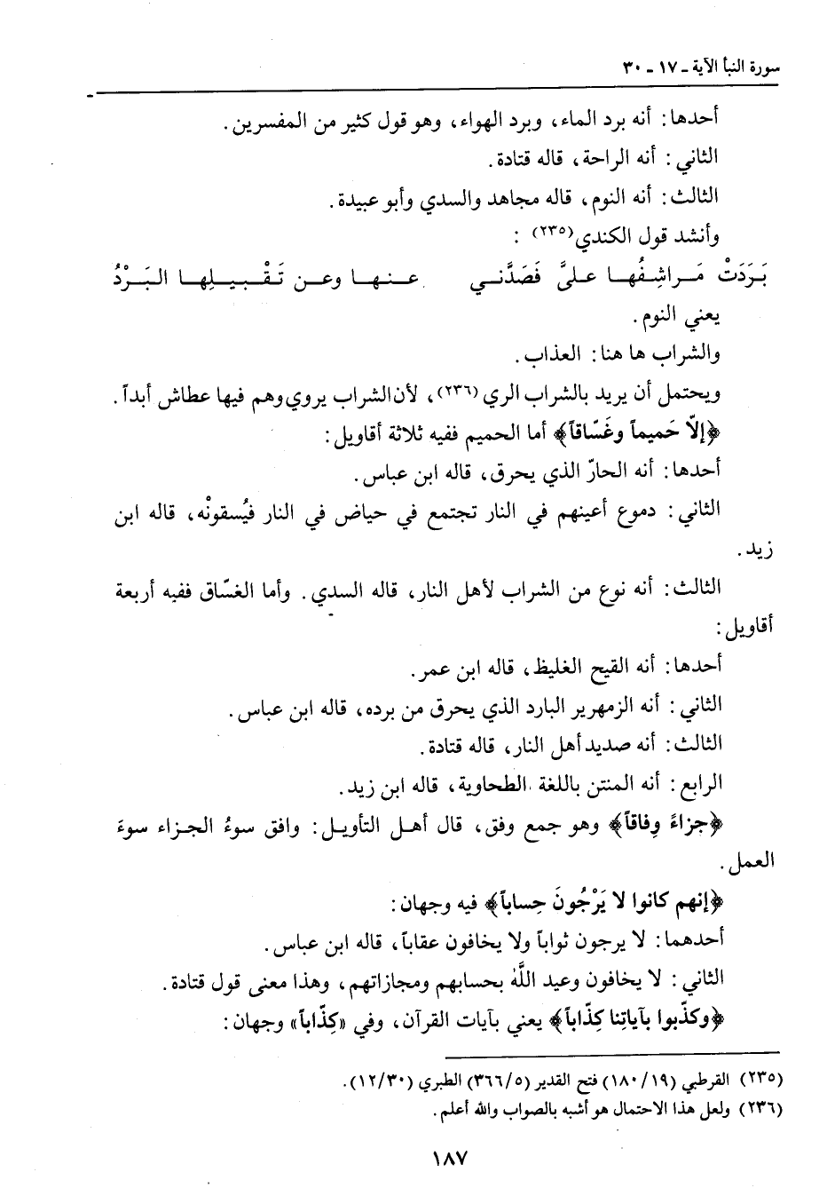 يعني النوم. والشراب ها هنا: العذاب. ويحتمل أن يريد بالشراب الري , لأن الشراب يروي وهم فيها عطاش أبداً. {إلاّ حَميماً وغَسّاقاً} أما الحميم ففيه ثلاثة أقاويل: أحدها: أنه الحارّ الذي يحرق , قاله ابن عباس. الثاني: دموع أعينهم في النار تجتمع في حياض في النار فيُسقونْه , قاله ابن زيد. الثالث: أنه نوع من الشراب لأهل النار , قاله السدي. وأما الغسّاق ففيه أربعة أقاويل: أحدهاك أنه القيح الغليظ , قاله ابن عمر. الثاني: أنه الزمهرير البارد الذي يحرق من برده , قاله ابن عباس. الثالث: أنه صديد أهل النار , قاله قتادة. الرابع: أنه المنتن باللغة الطحاوية , قاله ابن زيد. {جزاءً وِفاقاً} وهو جمع وفق , قال أهل التأويل: وافق سوءُ الجزاء سوءَ العمل. {إنهم كانوا لا يَرْجُونَ حِساباً} فيه وجهان: أحدهما: لا يرجون ثواباً ولا يخافون عقاباً , قاله ابن عباس. الثاني: لا يخافون وعيد الله بحسابهم ومجازاتهم , وهذا معنى قول قتادة. {وكذّبوا بآياتِنا كِذّاباً} يعني بآيات القرآن , وفي (كِذّاباً) وجهان: