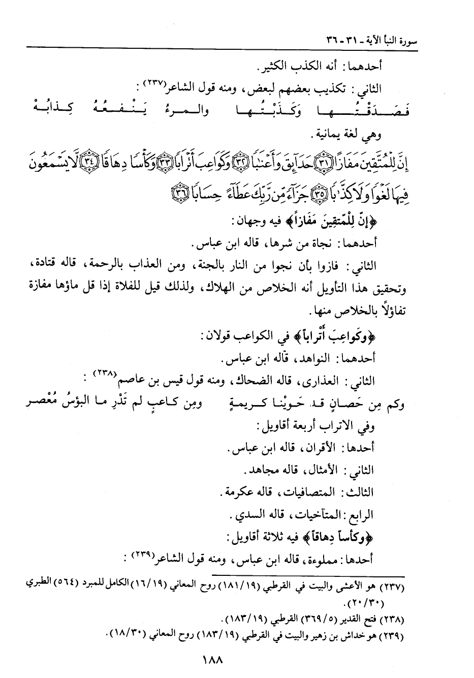 {إن للمتقين مفازا حدائق وأعنابا وكواعب أترابا وكأسا دهاقا لا يسمعون فيها لغوا ولا كذابا جزاء من ربك عطاء حسابا} {إنّ لِلْمُتَّقِينَ مَفَازاً} فيه وجهان: أحدهما: نجاة من شرها , قاله ابن عباس. الثاني: فازوا بأن نجوا من النار بالجنة , ومن العذاب بالرحمة , قاله قتادة , وتحقيق هذا التأويل أنه الخلاص من الهلاك , ولذلك قيل للفلاة إذا قل ماؤها مفازة تفاؤلاً بالخلاص منها. {وكَواعِبَ أَتْراباً} في الكواعب قولان: أحدهما: النواهد , قاله ابن عباس. الثاني: العذارى , قاله الضحاك , ومنه قول قيس بن عاصم: