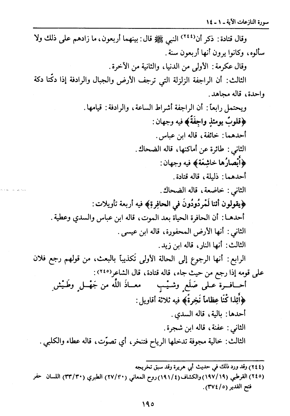 وقال قتادة: ذكر أن النبي صلى الله عليه وسلم قال: (بينهما أربعون , ما زادهم على ذلك ولا سألوه , وكانوا يرون أنها أربعون سنة). وقال عكرمة: الأولى من الدنيا , والثانية من الآخرة. الثالث: أن الراجفة الزلزلة التي ترجف الأرض والجبال والرادفة إذا دكّتا دكة واحدة , قاله مجاهد. ويحتمل رابعاً: أن الراجفة أشراط الساعة , والرادفة: قيامها. {قلوبٌ يومئذٍ واجِفَةٌ} فيه وجهان: أحدهما: خائفة , قاله ابن عباس. الثاني: طائرة عن أماكنها , قاله الضحاك. {أَبْصارُها خاشِعَة} فيه وجهان: أحدهما: ذليلة , قاله قتادة. الثاني: خاضعة , قاله الضحاك. {يقولون أئنا لَمْردودُونَ في الحافِرةِ} فيه أربعة تأويلات: أحدها: أن الحافرة الحياة بعد الموت , قاله ابن عباس والسدي وعطية. الثاني: أنها الأرض المحفورة , قاله ابن عيسى. الثالث: أنها النار , قاله ابن زيد. الرابع: أنها الرجوع إلى الحالة الأولى تَكذيباً بالبعث , من قولهم رجع فلان على قومه إذا رجع من حيث جاء , قاله قتادة , قال الشاعر:
