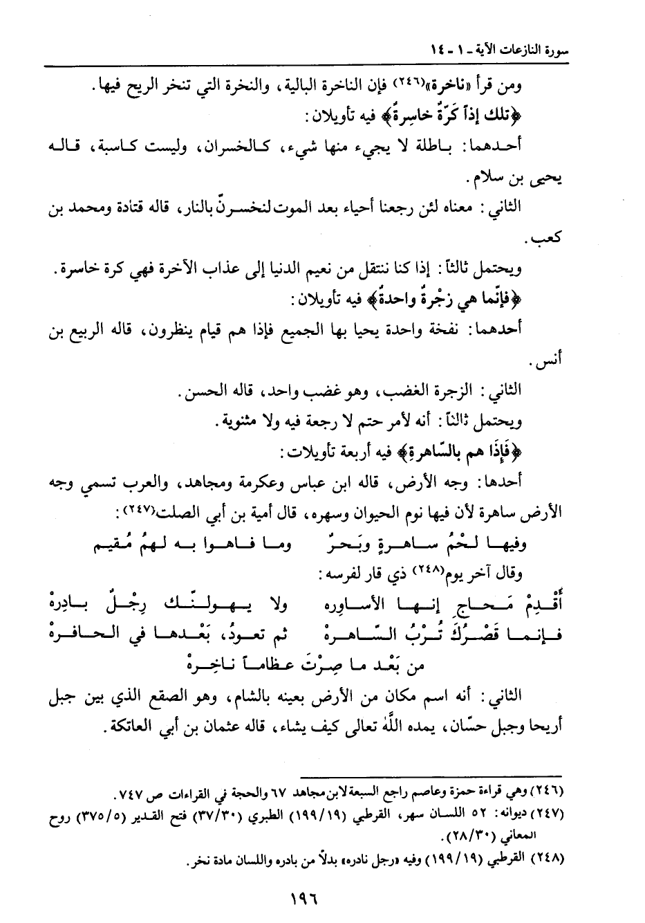 ومن قرأ (ناخرة) فإن الناخرة البالية , والنخرة التي تنخر الريح فيها. {تلك إذاً كَرّةٌ خاسِرةٌ} فيه تأويلان: أحدهما: باطلة لا يجيء منها شيء , كالخسران , وليست كاسبة , قاله يحيى بن سلام. الثاني: معناه لئن رجعنا أحياء بعد الموت لنخسرنّ بالنار , قاله قتادة ومحمد بن كعب. ويحتمل ثالثاً: إذا كنا ننتقل من نعيم الدنيا إلى عذاب الآخرة فهي كرة خاسرة. {فإنّما هي زجْرةٌ واحدةٌ} فيه تأويلان: أحدهما: نفخة واحدة يحيا بها الجميع فإذا هم قيام ينظرون , قاله الربيع بن أنس. الثاني: الزجرة الغضب , وهو غضب واحد , قاله الحسن. ويحتمل ثالثاً: أنه لأمر حتم لا رجعة فيه ولا مثنوية. {فَإذَا هم بالسّاهرةِ} فيه أربعة تأويلات: أحدها: وجه الأرض , قاله ابن عباس وعكرمة ومجاهد , والعرب تسمي وجه الأرض ساهرة لأن فيها نوم الحيوان وسهره , قال أمية بن أبي الصلت:
