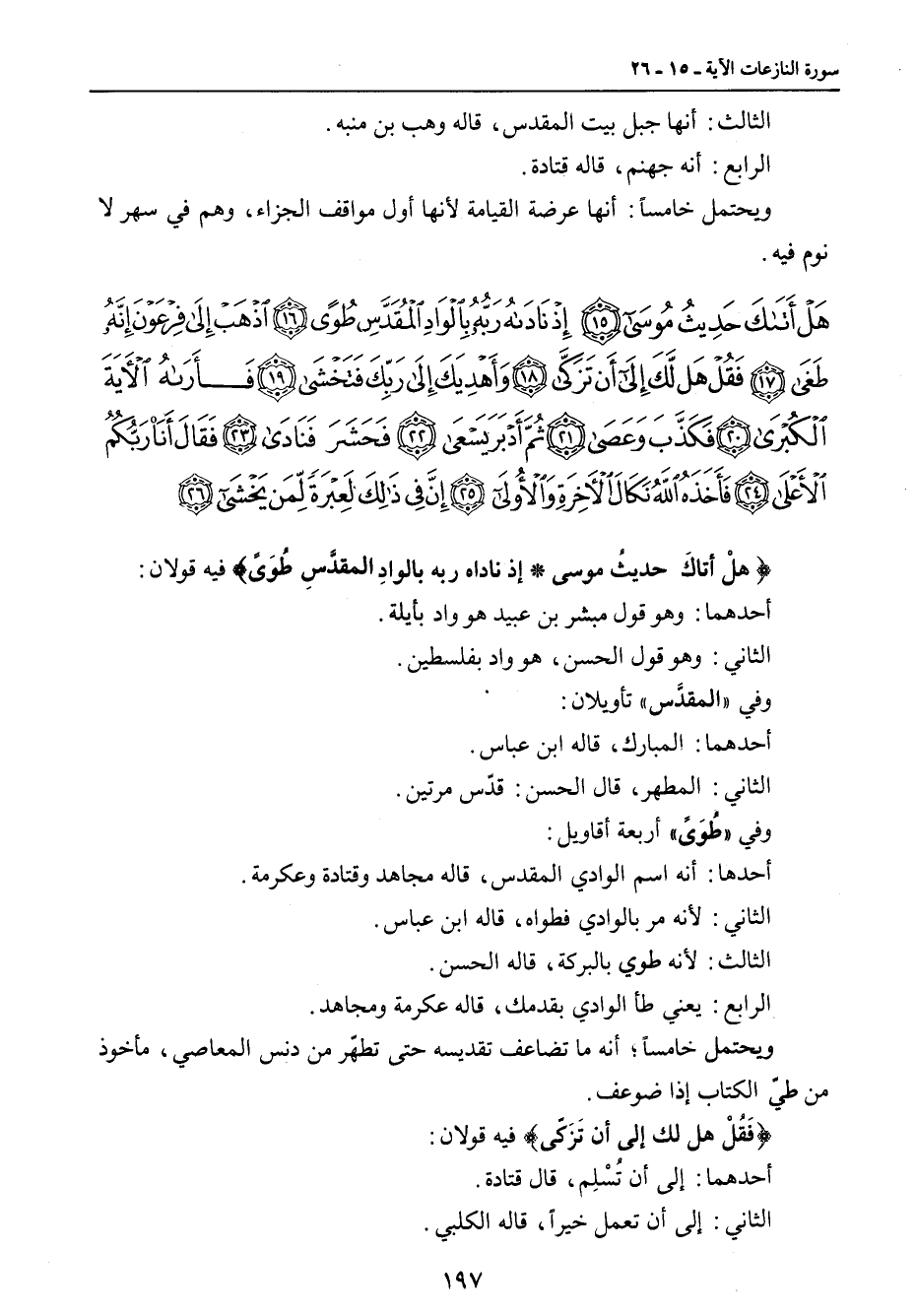 {هل أتاك حديث موسى إذ ناداه ربه بالواد المقدس طوى اذهب إلى فرعون إنه طغى فقل هل لك إلى أن تزكى وأهديك إلى ربك فتخشى فأراه الآية الكبرى فكذب وعصى ثم أدبر يسعى فحشر فنادى فقال أنا ربكم الأعلى فأخذه الله نكال الآخرة والأولى إن في ذلك لعبرة لمن يخشى} {هلْ أتاكَ حديثُ موسى إذ ناداه ربه بالوادِ المقدَّسِ طُوَىً} فيه قولان: أحدهما: وهو قول مبشر بن عبيد هو واد بأيلة. الثاني: وهو قول الحسن , هو واد بفلسطين. وفي (المقدَّس) تأويلان: أحدهما: المبارك , قاله ابن عباس. الثاني: المطهر , قاله الحسن: قدّس مرتين. وفي (طُوَىً) أربعة أقاويل: أحدها: أنه أسم الوادي المقدس , قاله مجاهد وقتادة وعكرمة. الثاني: لأنه مر بالوادي فطواه , قاله ابن عباس. الثالث: لأنه طوي بالبركة , قاله الحسن. الرابع: يعني طأ الوادي بقدمك , قاله عكرمة ومجاهد. ويحتمل خامساً؛ أنه ما تضاعف تقديسه حتى تطهّر من دنس المعاصي , مأخوذ من طيّ الكتاب إذا ضوعف. {فَقُلْ هل لك إلى أن تَزَكّى} فيه قولان: أحدهما: إلى أن تُسْلِم , قال قتادة. الثاني: إلى أن تعمل خيراً، قاله الكلبي.