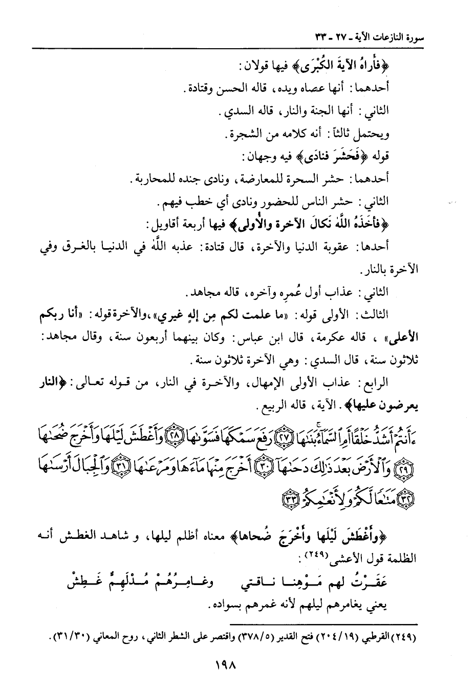 {فأَراهُ الآيةَ الكُبْرَى} فيها قولان: أحدهما: أنها عصاه ويده، قاله الحسن وقتادة. الثاني: أنها الجنة والنار، قاله السدي. ويحتمل ثالثاً: أنه كلامه من الشجرة. قوله {فَحَشَرَ فنادَى} فيه وجهان: أحدهما: حشر السحرة للمعارضة، ونادى جنده للمحاربة. الثاني: حشر الناس للحضور ونادى أي خطب فيهم. {فأخَذَهُ الله نَكالََ الآخرة والأُولى} فيها أربعة أقاويل: أحدها: عقوبة الدنيا والآخرة , قال قتادة: عذبه الله في الدنيا بالغرق وفي الآخرة بالنار. الثاني: عذاب أول عُمرِه وآخره , قاله مجاهد. الثالث: الأولى قوله: (ما علمت لكم مِن إلهٍ غيري) والآخرة قوله (أنا ربكم الأعلى) , قاله عكرمة , قال ابن عباس: وكان بينهما أربعون سنة , وقال مجاهد: ثلاثون سنة , قال السدي: وهي الآخرة ثلاثون سنة. الرابع: عذاب الأولى الإمهال , والآخرة في النار , من قوله تعالى: {النار يعرضون عليها} الآية , قاله الربيع.