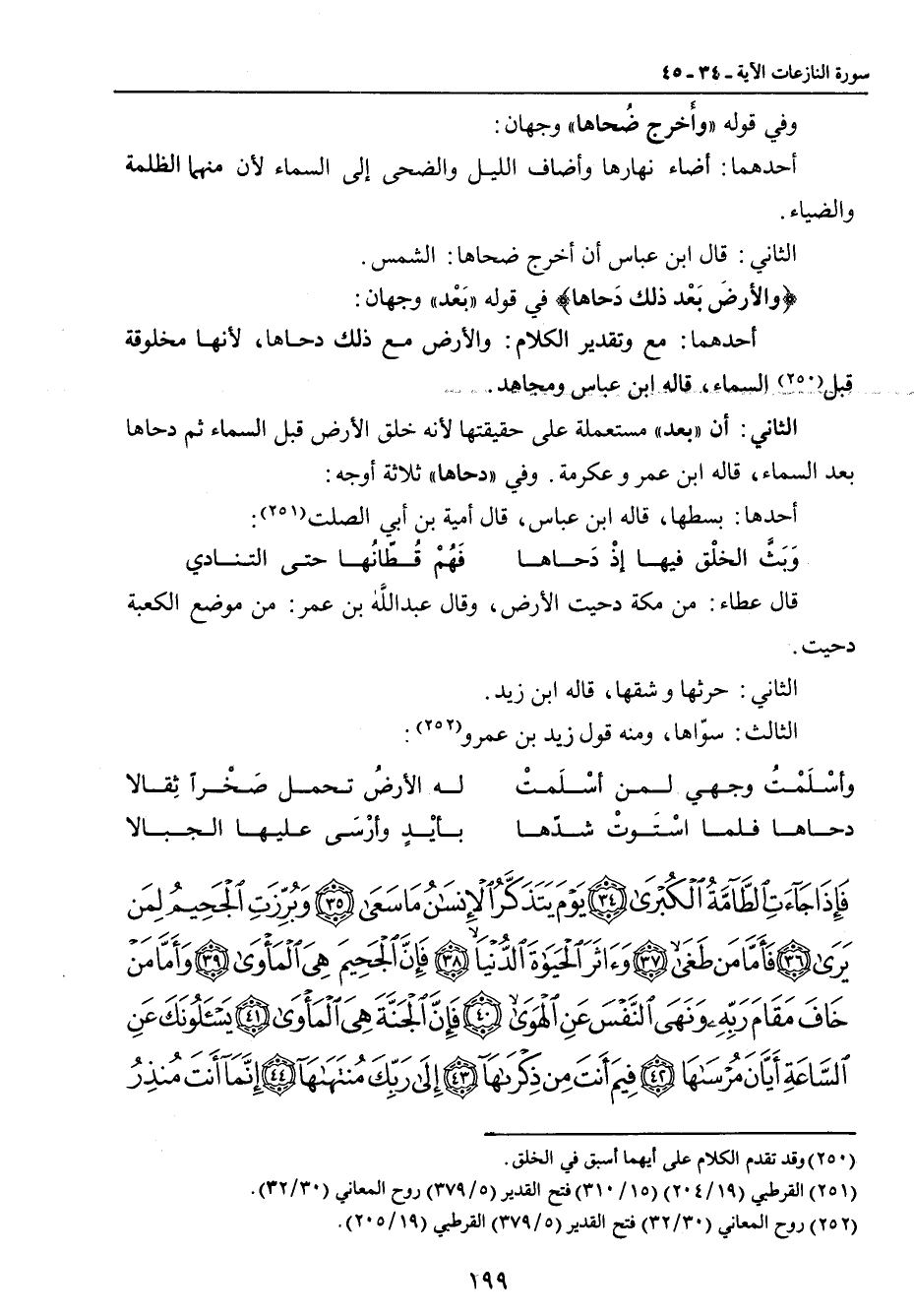 وفي قوله: (وأخرج ضُحاها) وجهان: أحدهما: أضاء نهارها وأضاف الليل والضحى إلى السماء لأن منهما الظلمة والضياء. الثاني: قال ابن عباس أن أخرج ضحاها: الشمس. {والأرضَ بَعْد ذلك دَحاها} في قوله (بَعْد) وجهان: أحدهما: مع وتقدير الكلام: والأرض مع ذلك دحاها , لأنها مخلوقة قبل السماء , قاله ابن عباس ومجاهد. الثاني: أن (بعد) مستعملة على حقيقتها لأنه خلق الأرض قبل السماء ثم دحاها بعد السماء , قاله ابن عمر وعكرمة. وفي (دحاها) ثلاثة أوجه: أحدها: بسطها , قاله ابن عباس , قال أمية بن أبي الصلت: