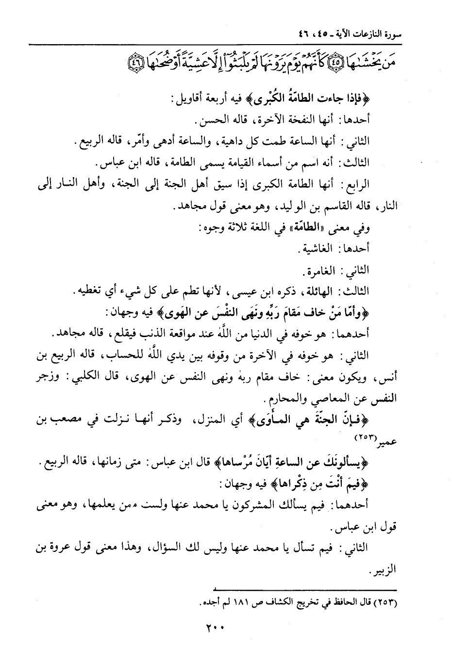 من يخشاها كأنهم يوم يرونها لم يلبثوا إلا عشية أو ضحاها} {فإذا جاءت الطامّةُ الكُُبْرى} فيه أربعة أقاويل: أحدها: أنها النفخة الآخرة، قاله الحسن. الثاني: أنها الساعة طمت كل داهية، والساعة أدهى وأمّر، قاله الربيع. الثالث: أنه اسم من أسماء القيامة يسمى الطامة، قاله ابن عباس. الرابع: أنها الطامة الكبرى إذا سيق أهل الجنة إلى الجنة، وأهل النار إلى النار، قاله القاسم بن الوليد، وهو معنى قول مجاهد. وفي معنى (الطامّة) في اللغة ثلاثة وجوه: أحدها: الغاشية. الثاني: الغامرة. الثالث: الهائلة , ذكره ابن عيسى , لأنها تطم على كل شيء أي تغطيه. {وأمّا مَنْ خاف مَقام رَبِّهِ ونَهَى النفْسَ عن الهَوى} فيه وجهان: أحدهما: هو خوفه في الدنيا من الله عند مواقعة الذنب فيقلع , قاله مجاهد. الثاني: هو خوفه في الآخرة من وقوفة بين يدي الله للحساب , قاله الربيع بن أنس , ويكون معنى: خاف مقام ربه ونهى النفس عن الهوى , قال الكلبي: وزجر النفس عن المعاصي والمحارم. {فإنّ الجنّةَ هي المأوَى} أي المنزل , وذكر أنها نزلت في مصعب بن عمير. {يسألونَكَ عن الساعةِ أيّانَ مُرْساها} قال ابن عباس: متى زمانها , قاله الربيع {فيمَ أنْتَ مِن ذِكْراها} فيه وجهان: أحدهما: فيم يسألك المشركون يا محمد عنها ولست ممن يعلمها , وهو معنى قول ابن عباس. الثاني: فيم تسأل يا محمد عنها وليس لك السؤال , وهذا معنى قول عروة بن الزبير.
