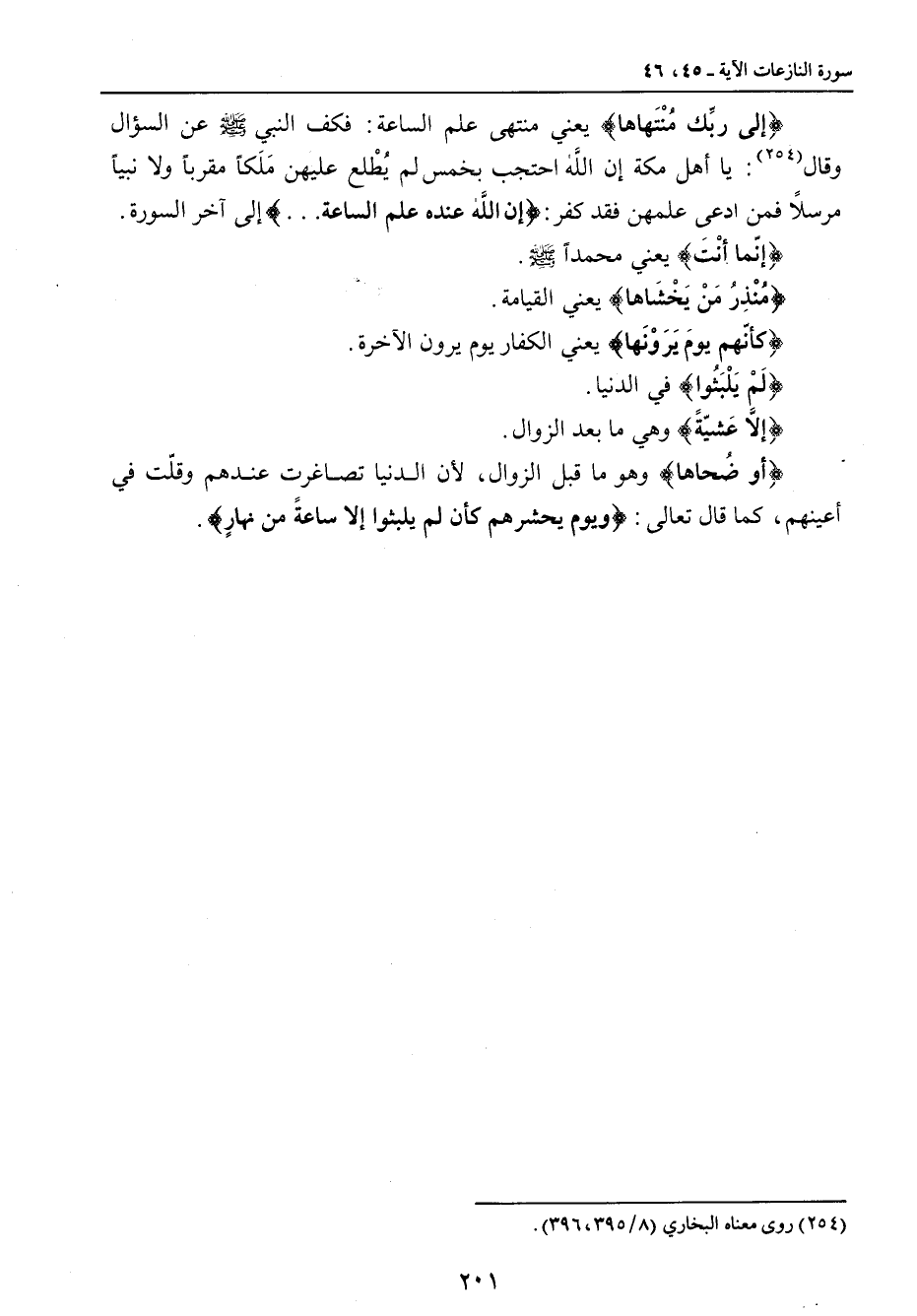 {إلى ربِّك مُنْتَهاها} يعني منتهى علم الساعة: فكف النبي صلى الله عليه وسلم عن السؤال وقال: يا أهل مكة إن الله احتجب بخمس لم يُطْلع عيهن مَلَكاً مقرباً ولا نبياً مرسلاً فمن ادعى علمهن فقد كفر: {إن اللَّه عنده علم الساعة ... } إلى آخر السورة. {إنّما أنْتَ} يعني محمداً صلى الله عليه وسلم. {مَنْذِرُ مَنْ يَخْشَاها} يعني القيامة. {كأنّهم يومَ يَرَوْنَها} يعني الكفار يوم يرون الآخرة. {لَمْ يَلْبَثُوا} في الدنيا. {إلاَّ عَشيّةً} وهي ما بعد الزوال. {أو ضُحاها} وهو ما قبل الزوال , لأن الدنيا تصاغرت عندهم وقلّت في أعينهم , كما قال تعالى: {ويوم يحشرهم كأن لم يلبثوا إلا ساعةً من نهارٍ}.