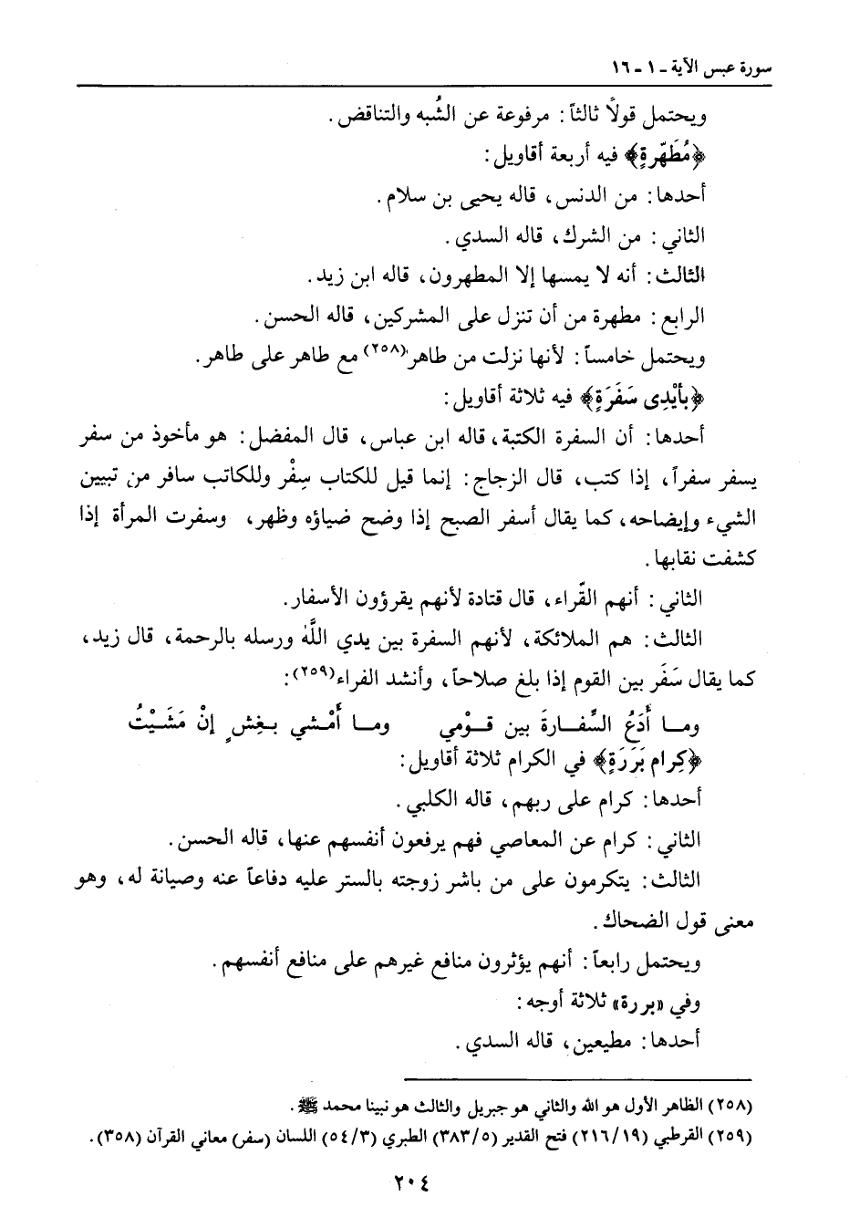 ويحتمل قولاً ثالثاً: مرفوعة عن الشُبه والتناقض. {مُطَهّرةٍ} فيه أربعة أقاويل: أحدهأ: من الدنس , قاله يحيى بن سلام. الثاني: من الشرك , قاله السدي. الثالث: أنه لا يمسها إلا المطهرون , قاله ابن زيد. الرابع: مطهرة من أن تنزل على المشركين , قاله الحسن. ويحتمل خامساً: لأنها نزلت من طاهر مع طاهر على طاهر. {بأيْدِى سَفَرَةٍ} فيه ثلاثة أقاويل: أحدها: أن السفرة الكتبة , قاله ابن عباس , قال المفضل: هو مأخوذ من سفر يسفر سفراً , إذا كتب , قال الزجاج: إنما قيل للكتاب سِفْر وللكاتب سافر من تبيين الشيء وإيضاحه , كما يقال أسفر الصبح إذا وضح ضياؤه وظهر , وسفرت المرأة إذا كشفت نقابها. الثاني: أنهم القّراء , قال قتادة لأنهم يقرؤون الأسفار. الثالث: هم الملائكة , لأنهم السفرة بين يدي الله ورسله بالرحمة , قال زيد , كما يقال سَفَر بين القوم إذا بلغ صلاحاً , وأنشد الفراء: