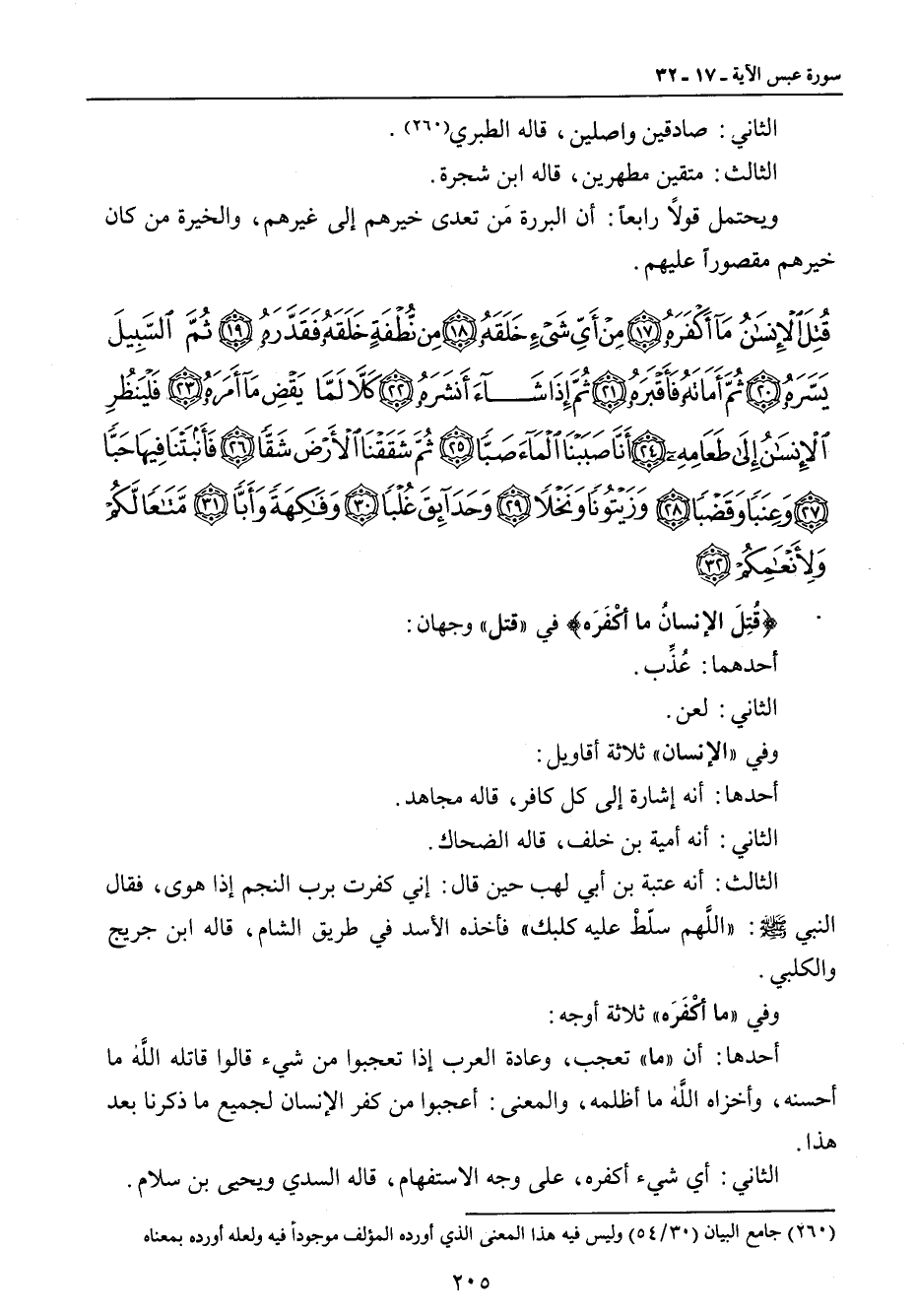 {قتل الإنسان ما أكفره من أي شيء خلقه من نطفة خلقه فقدره ثم السبيل يسره ثم أماته فأقبره ثم إذا شاء أنشره كلا لما يقض ما أمره فلينظر الإنسان إلى طعامه أنا صببنا الماء صبا ثم شققنا الأرض شقا فأنبتنا فيها حبا وعنبا وقضبا وزيتونا ونخلا وحدائق غلبا وفاكهة وأبا متاعا لكم ولأنعامكم} {قُتِلَ الإنسانُ ما أكْفَرَه} في (قتل) وجهان: أحدهما: عُذِّب. الثاني: لعن. وفي (الإنسان) ثلاثة أقاويل: أحدها: أنه إشارة إلى كل كافر , قاله مجاهد. الثاني: أنه أمية بن خلف , قاله الضحاك. الثالث: أنه عتبة بن أبي لهب حين قال: إني كفرت برب النجم إذا هوى , فقال النبي صلى الله عليه وسلم: (اللَّهم سلّطْ عليه كلبك) فأخذه الأسد في طريق الشام , قاله ابن جريج والكلبي. وفي (ما أكْفَرَه) ثلاثة أوجه: أحدها: أن (ما) تعجب , وعادة العرب إذا تعجبوا من شيء قالوا قاتله الله ما أحسنه , وأخزاه الله ما أظلمه , والمعنى: أعجبوا من كفر الإنسان لجميع ما ذكرنا بعد هذا. الثاني: أي شيء أكفره , على وجه الاستفهام , قاله السدي ويحيى بن سلام.