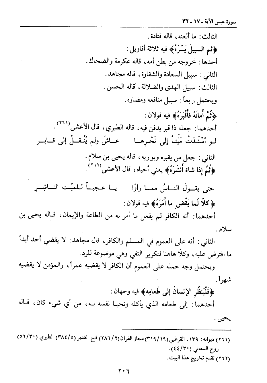 الثالث: ما ألعنه , قاله قتادة. {ثم السبيلَ يَسّرَهُ} فيه ثلاثة أقاويل: أحدها: خروجه من بطن أمه , قاله عكرمة والضحاك. الثاني: سبيل السعادة والشقاوة , قاله مجاهد. الثالث: سبيل الهدى والضلالة , قاله الحسن. ويحتمل رابعاً: سبيل منافعه ومضاره. {ثُمَّ أَماتَهُ فأَقْبَرَهُ} فيه قولان: أحدهما: جعله ذا قبر يدفن فيه , قاله الطبري , قال الأعشى: