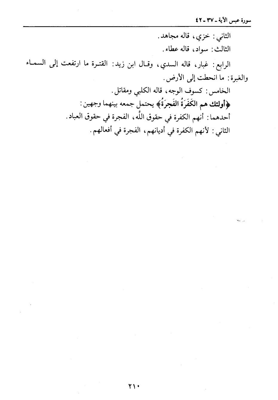 الثاني: خزي , قال مجاهد. الثالث: سواد , قاله عطاء. الرابع: غبار , قاله السدي , وقال ابن زيد: القترة ما ارتفعت إلى السماء والغبرة: ما انحطت إلى الأرض. الخامس: كسوف الوجه , قاله الكلبي ومقاتل. {أولئك هم الكَفَرَةُ الفَجرَةُ} يحتمل جمعه بينهما وجهين: أحدهما: أنهم الكفرة في حقوق الله , الفجرة في حقوق العباد. الثاني: لأنهم الكفرة في أديانهم , الفجرة في أفعالهم.