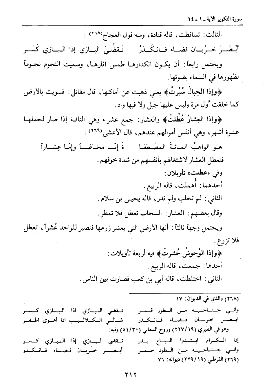 فتعطل العشار لاشتغالهم بأنفسهم من شدة خوفهم. وفي (عطلت) تأويلان: أحدهما: أُهملت , قاله الربيع. الثاني: لم تحلب ولم تدر , قاله يحيى بن سلام. وقال بعضهم: العشار: السحاب تعطل فلا تمطر. ويحتمل وجهاً ثالثاً: أنها الأرض التي يعشر زرعها فتصير للواحد عُشراً , تعطل فلا تزرع. {وإذا الوُحوشُ حُشِرتْ} فيه أربعة تأويلات: أحدها: جمعت , قاله الربيع. الثاني: اختلطت , قاله أبي بن كعب فصارت بين الناس.