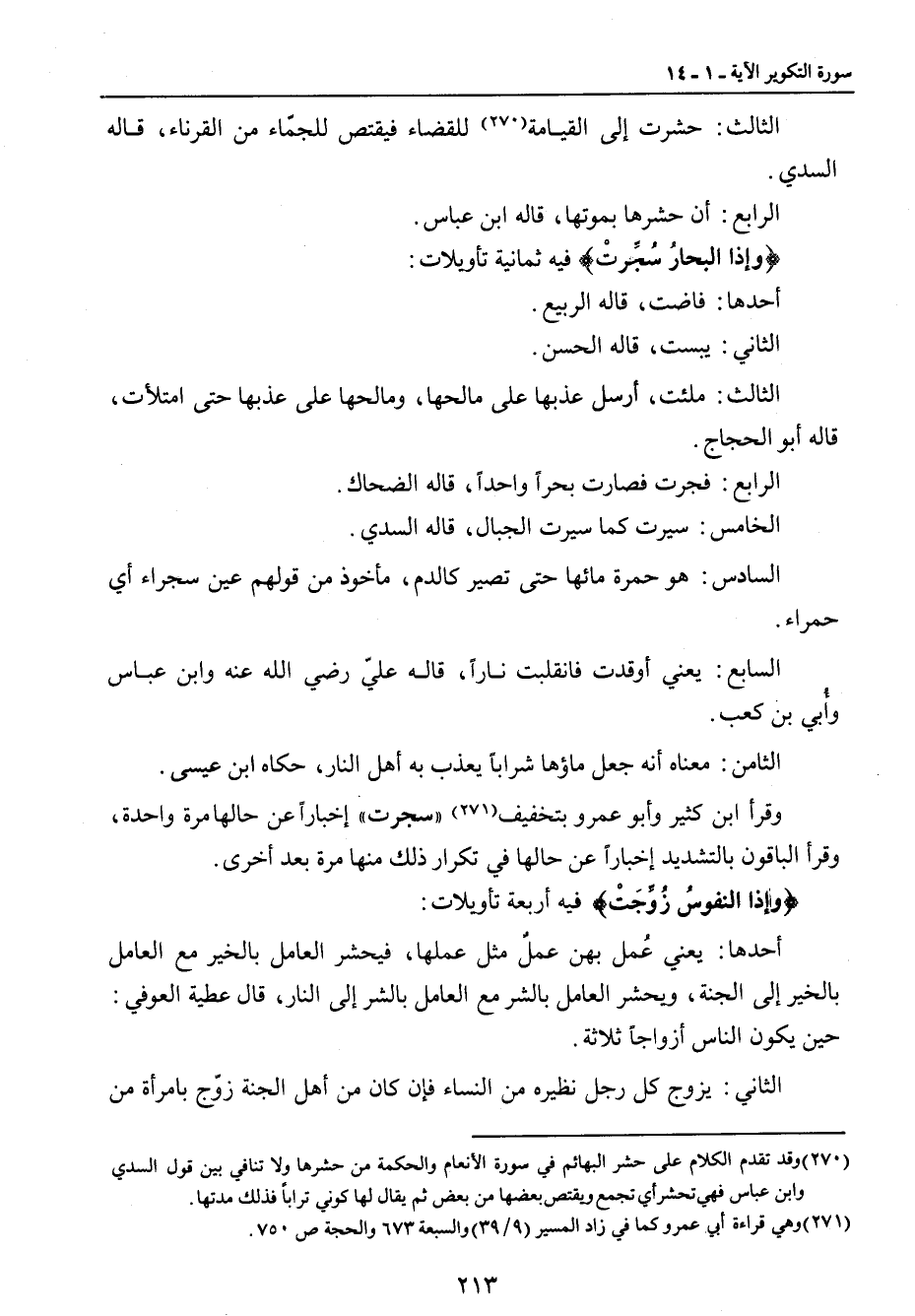 الثالث: حشرت إلى القيامة للقضاء فيقتص للجمّاء من القرناء , قاله السدي. الرابع: أن حشرها بموتها , قاله ابن عباس. {وإذا البحارُ سُجِّرتْ} فيه ثمانية تأويلات: أحدها: فاضت , قاله الربيع. الثاني: يبست , قاله الحسن. الثالث: ملئت , أرسل عذبها على مالحها , ومالحها على عذبها حتى امتلأت , قاله أبو الحجاج. الرابع: فجرت فصارت بحراً واحداً , قاله الضحاك. الخامس: سيرت كما سيرت الجبال , قاله السدي. السادس: هو حمرة مائها حتى تصير كالدم , مأخوذ من قولهم عين سجراء أي حمراء. السابع: يعني أوقدت فانقلبت ناراً , قاله عليّ رضي الله عنه وابن عباس وأُبي بن كعب. الثامن: معناه أنه جعل ماؤها شراباً يعذب به أهل النار , حكاه ابن عيسى. وقرأ ابن كثير وأبو عمرو بتخفيف (سجرت) إخباراً عن حالها مرة واحدة , وقرأ الباقون بالتشديد إخباراً عن حالها في تكرار ذلك منها مرة بعد أخرى. {وإذا النفوسُ زُوِّجَتْ} فيه أربعة تأويلات: أحدها: يعني عُمل بهن عملٌ مثل عملها , فيحشر العامل بالخير مع العامل بالخير إلى الجنة , ويحشر العامل بالشر مع العامل بالشر إلى النار , قاله عطية العوفي: حين يكون الناس أزواجاً ثلاثة. الثاني: يزوج كل رجل نظيره من النساء فإن من أهل الجنة زوّج بامرأة من