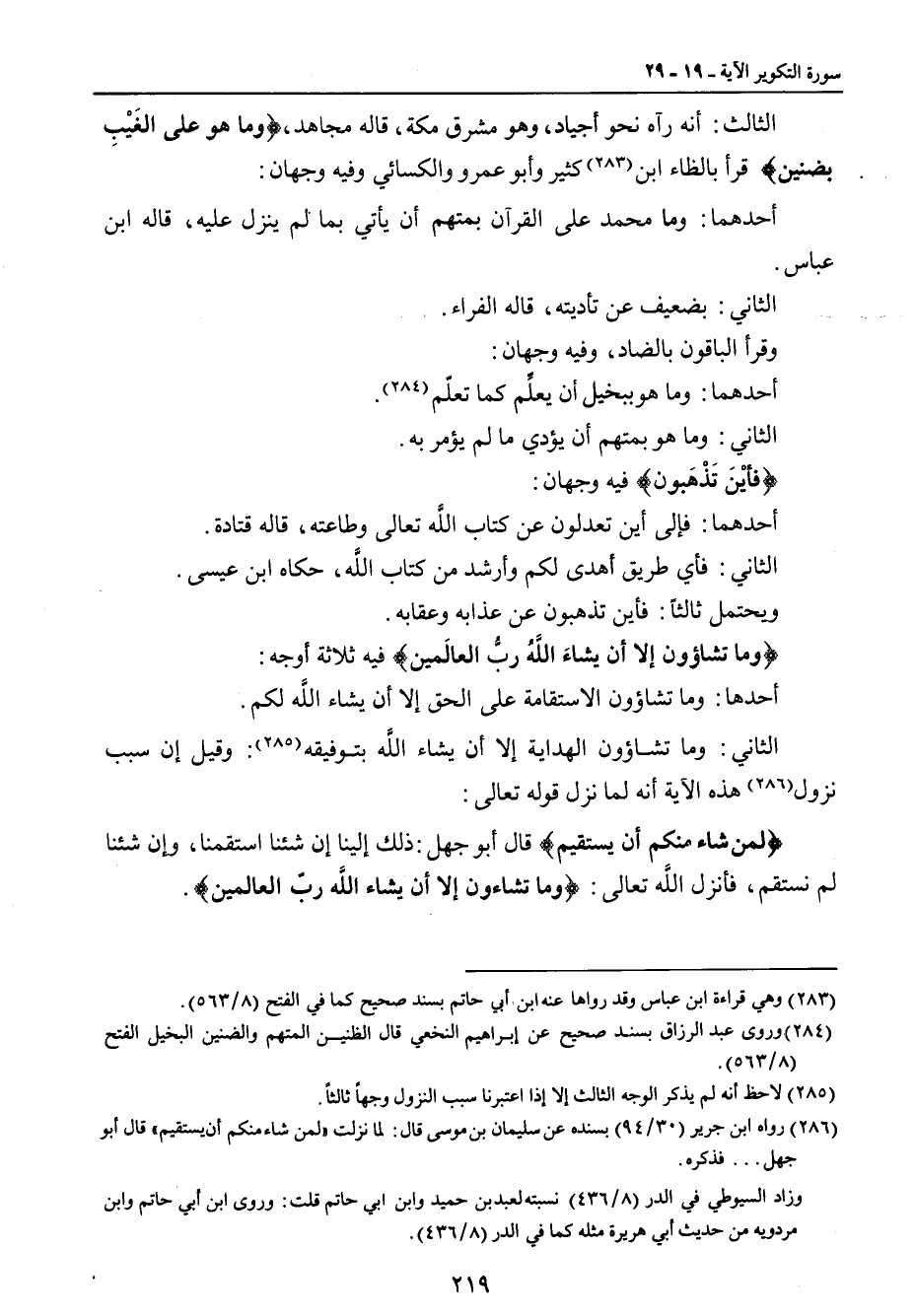 الثالث: أنه رآه نحو أجياد، وهو مشرق مكة، قاله مجاهد، {وما هو على الغَيْبِ بضنين} قرأ بالظاء ابن كثير وأبو عمرو والكسائي وفيه وجهان: أحدهما: وما محمد على القرآن بمتهم أن يأتي بما لم ينزل عليه , قاله ابن عباس. الثاني: بضعيف عن تأديته , قاله الفراء. وقرأ الباقون بالضاد , وفيه وجهان: أحدهما: وما هو ببخيل أن يعلِّم كما تعلّم. الثاني: وما هو بمتهم أن يؤدي ما لم يؤمر به. {فأيْنَ تَذْهَبون} فيه وجهان: أحدهما: فإلى أين تعدلون عن كتاب الله تعالى وطاعته , قاله قتادة. الثاني: فأي طريق أهدى لكم وأرشد من كتاب الله , حكاه ابن عيسى. ويحتمل ثالثاً: فأين تذهبون عن عذابه وعقابه. {وما تشاؤون إلا أن يشاءَ اللهُ ربُّ العالَمين} فيه ثلاثة أوجه: أحدها: وما تشاؤون الاستقامة على الحق إلا أن يشاء الله لكم. الثاني: وما تشاؤون الهداية إلا أن يشاء الله بتوفيقه: وقيل إن سبب نزول هذه الآية أنه لما نزل قوله تعالى: {لمن شاء منكم أن يستقيم} قال أبو جهل: ذلك إلينا إن شئنا استقمنا , وإن شئنا لم نستقم , فأنزل الله تعالى: {وما تشاءون إلا أن يشاء الله ربّ العالمين}.
