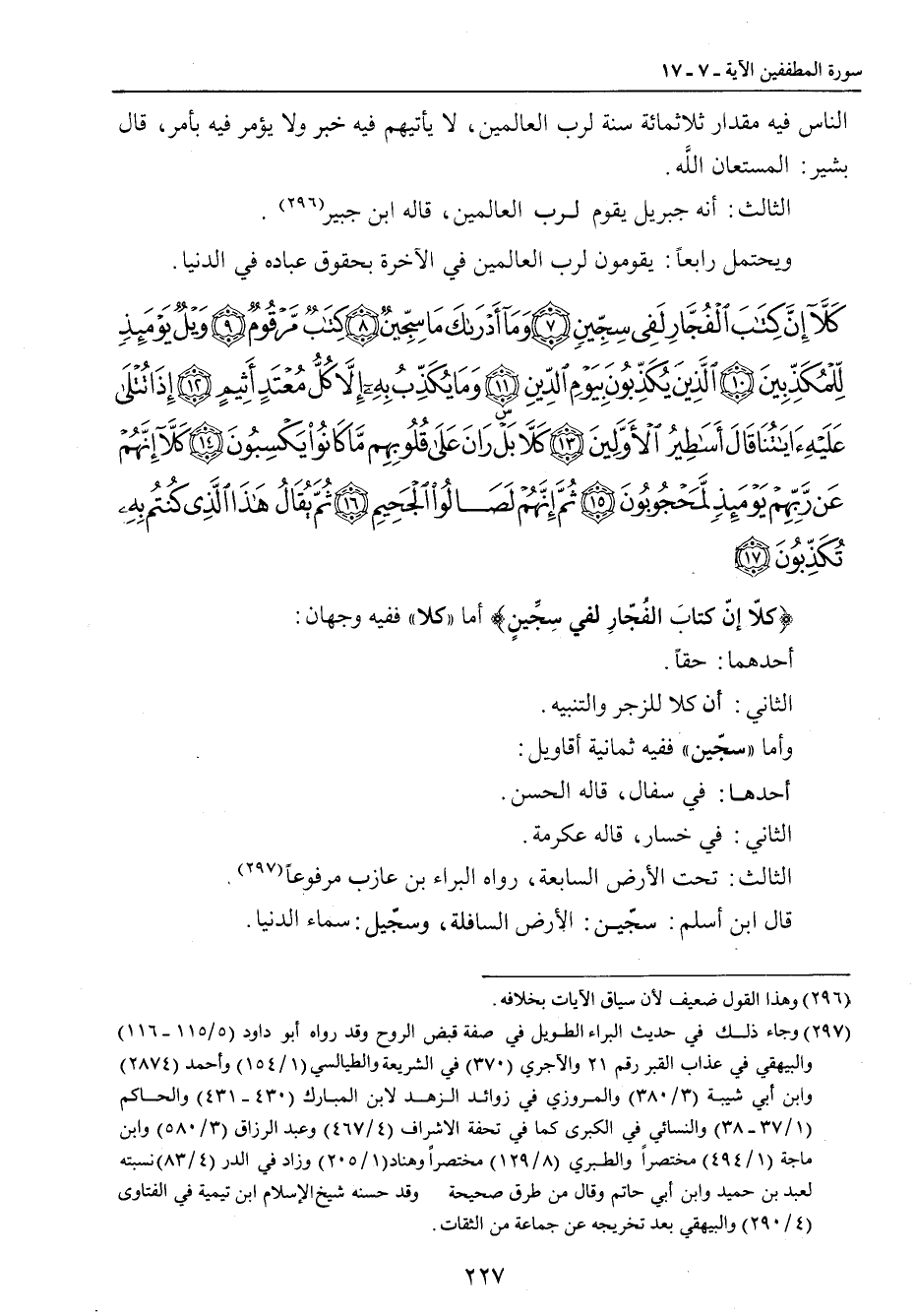 {كلا إن كتاب الفجار لفي سجين وما أدراك ما سجين كتاب مرقوم ويل يومئذ للمكذبين الذين يكذبون بيوم الدين وما يكذب به إلا كل معتد أثيم إذا تتلى عليه آياتنا قال أساطير الأولين كلا بل ران على قلوبهم ما كانوا يكسبون كلا إنهم عن ربهم يومئذ لمحجوبون ثم إنهم لصالوا الجحيم ثم يقال هذا الذي كنتم به تكذبون} {كلاّ إنّ كتابَ الفُجّارِ لفي سِجِّينٍ} أما (كلا) ففيه وجهان: أحدهما: حقاً. الثاني: أن كلا للزجر والتنبيه. وأما (سجّين) ففيه ثمانية أقاويل: أحدها: في سفال , قاله الحسن. الثاني: في خسار , قاله عكرمة. الثالث: تحت الأرض السابعة , رواه البراء بن عازب مرفوعاً. قال ابن أسلم: سجّين: الأرض السافلة , وسجّيل: سماء الدنيا.