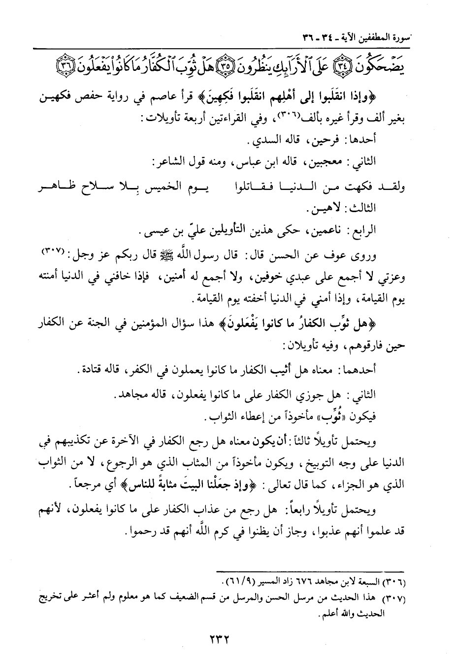 الثالث: لاهين. الرابع: ناعمين , حكى هذين التأويلين عليّ بن عيس. وروى عوف عن الحسن قال: قال رسول الله صلى الله عليه وسلم (قال ربكم عز وجل: وعزتي لا أجمع على عبدي خوفين , ولا أجمع له أمنين , فإذا خافني في الدنيا أمنته يوم القيامة , وإذا أمني في الدنيا أخفته يوم القيامة). {هل ثوِّب الكفارُ ما كانوا يَفْعَلونَ} هذا سؤال المؤمنين في الجنة عن الكفار حين فارقوهم , وفيه تأويلان: أحدهما: معناه هل أثيب الكفار ما كانوا يعلمون في الكفر , قاله قتادة. الثاني: هل جوزي الكفار على ما كانوا يفعلون , قاله مجاهد. فيكون (ثُوِّب) مأخوذاً من إعطاء الثواب. ويحتمل تأويلاً ثالثاً: أن يكون معناه هل رجع الكفار في الآخرة عن تكذيبهم في الدنيا على وجه التوبيخ , ويكون مأخوذاً من المثابِ الذي هو الرجوع , لا من الثواب الذي هو الجزاء , كما قال تعالى: {وإذا جعَلْنا البيتَ مثابةً للناس} أي مرجعاً. ويحتمل تأويلاً رابعاً: هل رجع من عذاب الكفار على ما كانوا يفعلون , لأنهم قد علموا أنهم عذبوا , وجاز أن يظنوا في كرم الله أنهم قد رحموا.