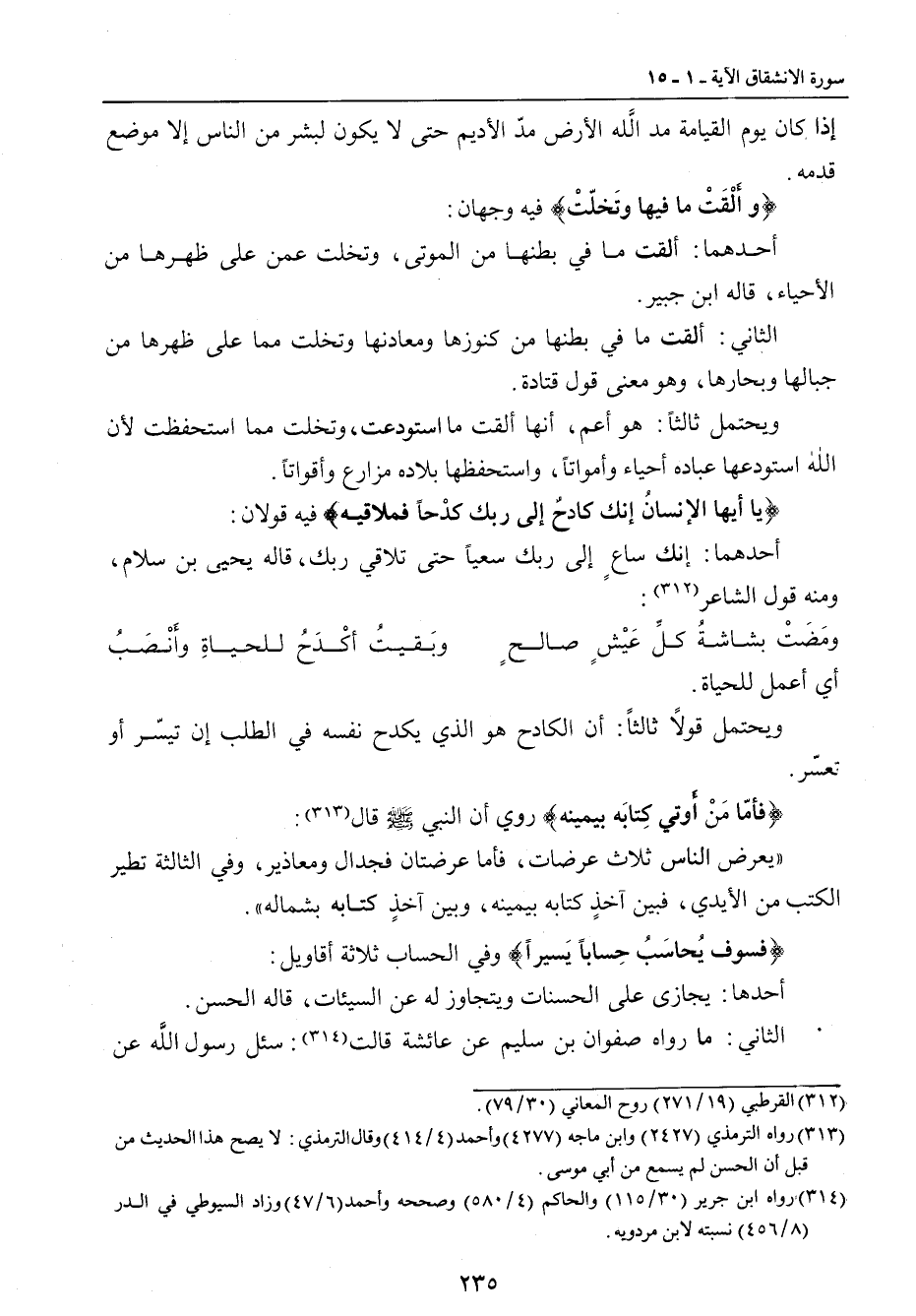(إذا كان يوم القيامة مد الله الأرض مدّ الأديم حتى لا يكون لبشر من الناس إلا موضع قدمه). {وأَلقْتْ ما فيها وتَخلّتْ} فيه وجهان: أحدهما: ألقت ما في بطنها من الموتى , وتخلت عمن على ظهرها من الأحياء , قاله ابن جبير. الثاني: ألقت ما في بطنها من كنوزها ومعادنها وتخلت مما على ظهرها من جبالها وبحارها , وهو معنى قول قتادة. ويحتمل ثالثاً: هو أعم , أنها ألقت ما استوعدت , وتخلت مما استحفظت لأن الله استودعها عباده أحياء وأمواتاً , واستحفظها بلاده مزارع وأقواتاً. {يا أيها الإنسانُ إنك كادحٌ إلى ربك كدْحاً فملاقيه} فيه قولان: أحدهما: إنك ساعٍ إلى ربك سعياً حتى تلاقي ربك , قاله يحيى بن سلام , ومنه قول الشاعر: