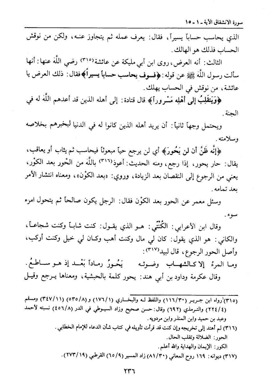 الذي يحاسب حساباً يسيراً , فقال: (يعرف عمله ثم يتجاوز عنه , ولكن من نوقش الحساب فذلك هو الهالك.) الثالث: أنه العرض , روى ابن أبي مليكة عن عائشة رضي الله عنها: أنها سألت رسول الله صلى الله عليه وسلم عن قوله: {فسوف يحاسب حساباً يسيراً} فقال: (ذلك العرض يا عائشة , من نوقش في الحساب يهلك). {وَيَنقَلِبُ إلى أهْلِه مَسْروراً} قال قتادة: إلى أهله الذين قد أعدهم الله له في الجنة. ويحتمل وجهاً ثانياً: أن يريد أهله الذين كانوا له في الدنيا ليخبرهم بخلاصه وسلامته. {إنَّه ظَنَّ أن لن يَحُورَ} أي لن يرجع حياً مبعوثاً فيحاسب ثم يثاب أو يعاقب , يقال: حار يحور , إذا رجع , ومنه الحديث: (أعوذ بالله من الحْور بعد الكْور ,) يعني من الرجوع إلى النقصان بعد الزيادة , وروي: (بعد الكوْن) , ومعناه انتشار الأمر بعد تمامه. وسئل معمر عن الحور بعد الكْون فقال: الرجل يكون صالحاً ثم يتحول امرء سوء. وقال ابن الأعرابي: الكُنْنّي: هو الذي يقول: كنت شاباً وكنت شجاعاً , والكاني: هو الذي يقول: كان لي مال وكنت أهب وكان لي خيل وكنت أركب , وأصل الحور الرجوع , قال لبيد: