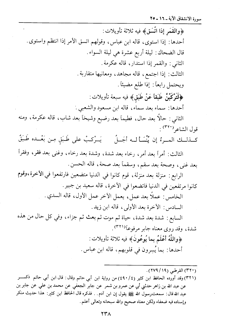 {والقَمَرِ إذا اتّسَق} فيه ثلاثة تأويلات: أحدها: إذا استوى , قاله ابن عباس , وقولهم اتسق الأمر إذا انتظم واستوى. قال الضحاك: ليلة أربع عشرة هي ليلة السواء. الثاني: والقمر إذا استدار , قاله عكرمة. الثالث: إذا اجتمع , قاله مجاهد , ومعانيها متقاربة. ويحتمل رابعاً: إذا طلع مضيئاً. {لَتَرْكَبُنَّ طُبقاً عَنِ طَبَقٍ} فيه سبعة تأويلات: أحدها: سماء بعد سماء , قاله ابن مسعود والشعبي. الثاني: حالاً بعد حال , فطيماً بعد رضيع وشيخاً بعد شاب , قاله عكرمة , ومنه قول الشاعر:
