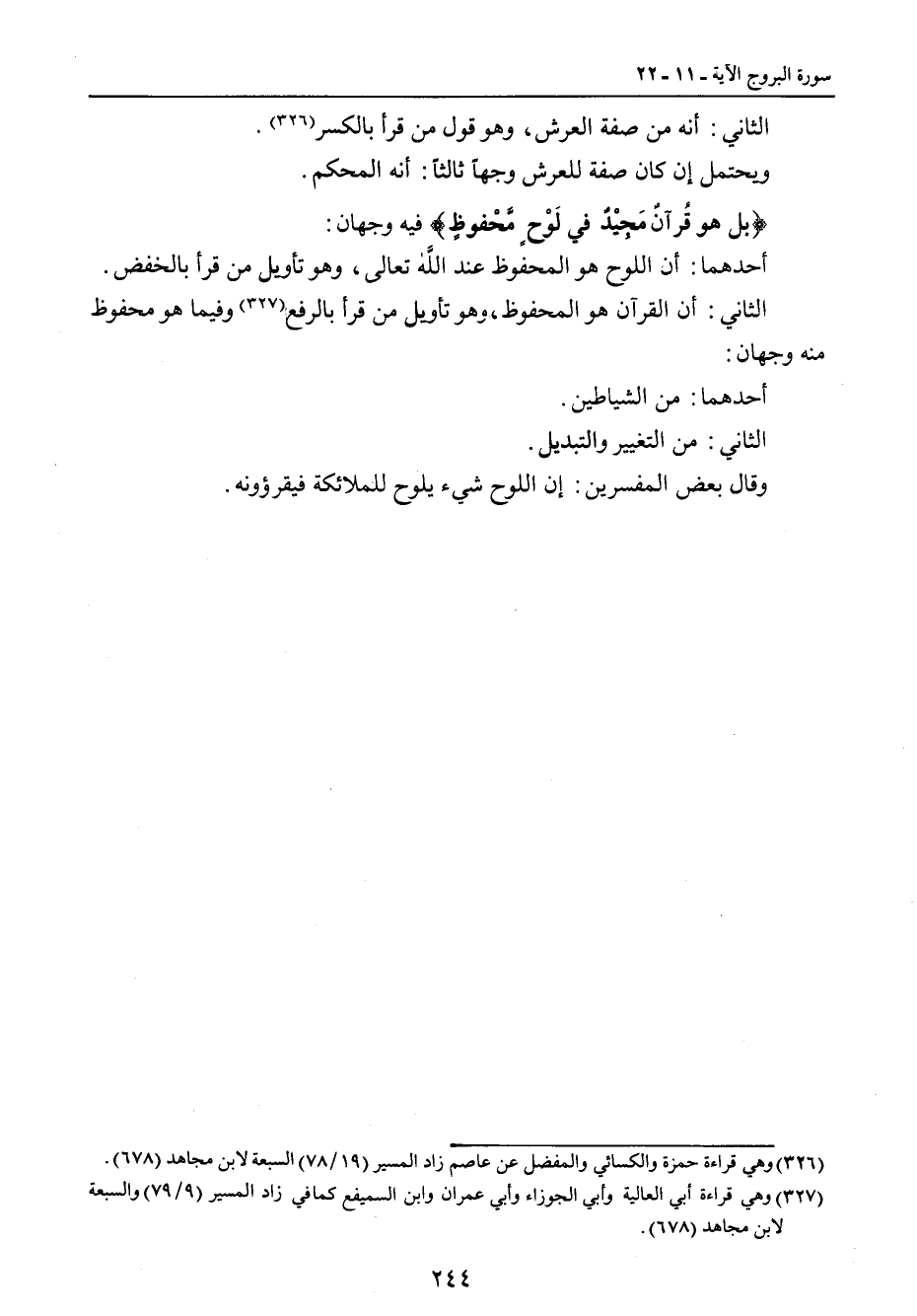 الثاني: أنه من صفة العرش، وهو قول من قرأ بالكسر. ويحتمل إن كان صفة للعرش وجهاً ثالثاً: أنه المحكم. {بل هو قُرآنٌ مَجِيْدٌ في لَوْحٍ مَّحفوظٍ} فيه وجهان: أحدهما: أن اللوح هو المحفوظ عند الله تعالى , وهو تأويل من قرأ بالخفض. الثاني: أن القرآن هو المحفوظ , وهو تأويل من قرأ بالرفع وفيما هو محفوظ منه وجهان: أحدهما: من الشياطين. الثاني: من التغيير والتبديل. وقال بعض المفسرين: إن اللوح شيء يلوح للملائكة فيقرؤونه.