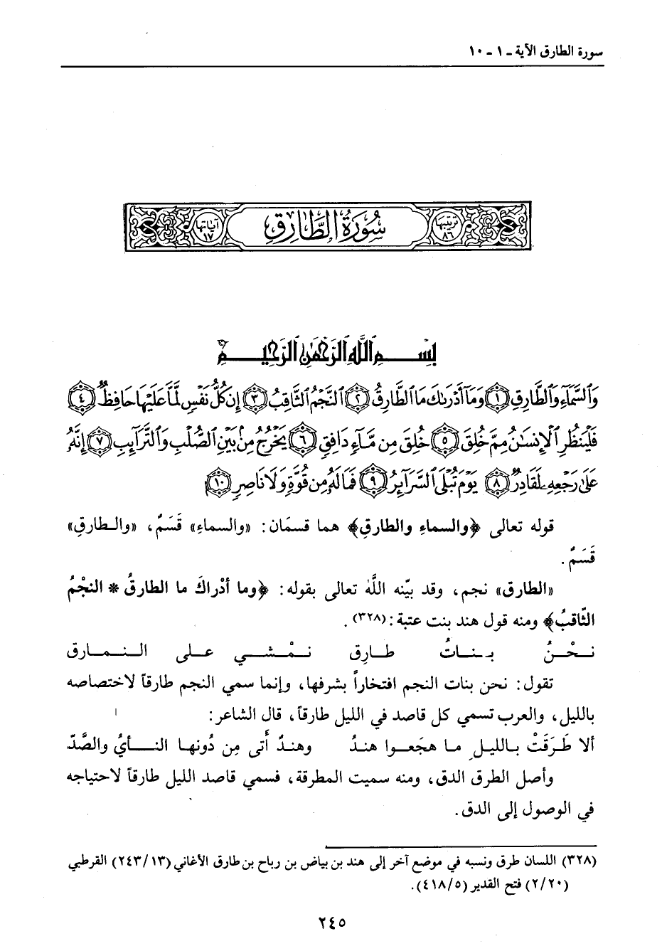 {والسماء والطارق وما أدراك ما الطارق النجم الثاقب إن كل نفس لما عليها حافظ فلينظر الإنسان مم خلق خلق من ماء دافق يخرج من بين الصلب والترائب إنه على رجعه لقادر يوم تبلى السرائر فما له من قوة ولا ناصر} قوله تعالى {والسماءِ والطارقِ} هما قسمَان: (والسماءِ) قَسَمٌ , (والطارقِ) قَسَمٌ. (الطارق) نجم , وقد بيّنه الله تعالى بقوله: {وما أدْراكَ ما الطارقُ النجْمُ الثّاقبُ} ومنه قول هند بنت عتبة: