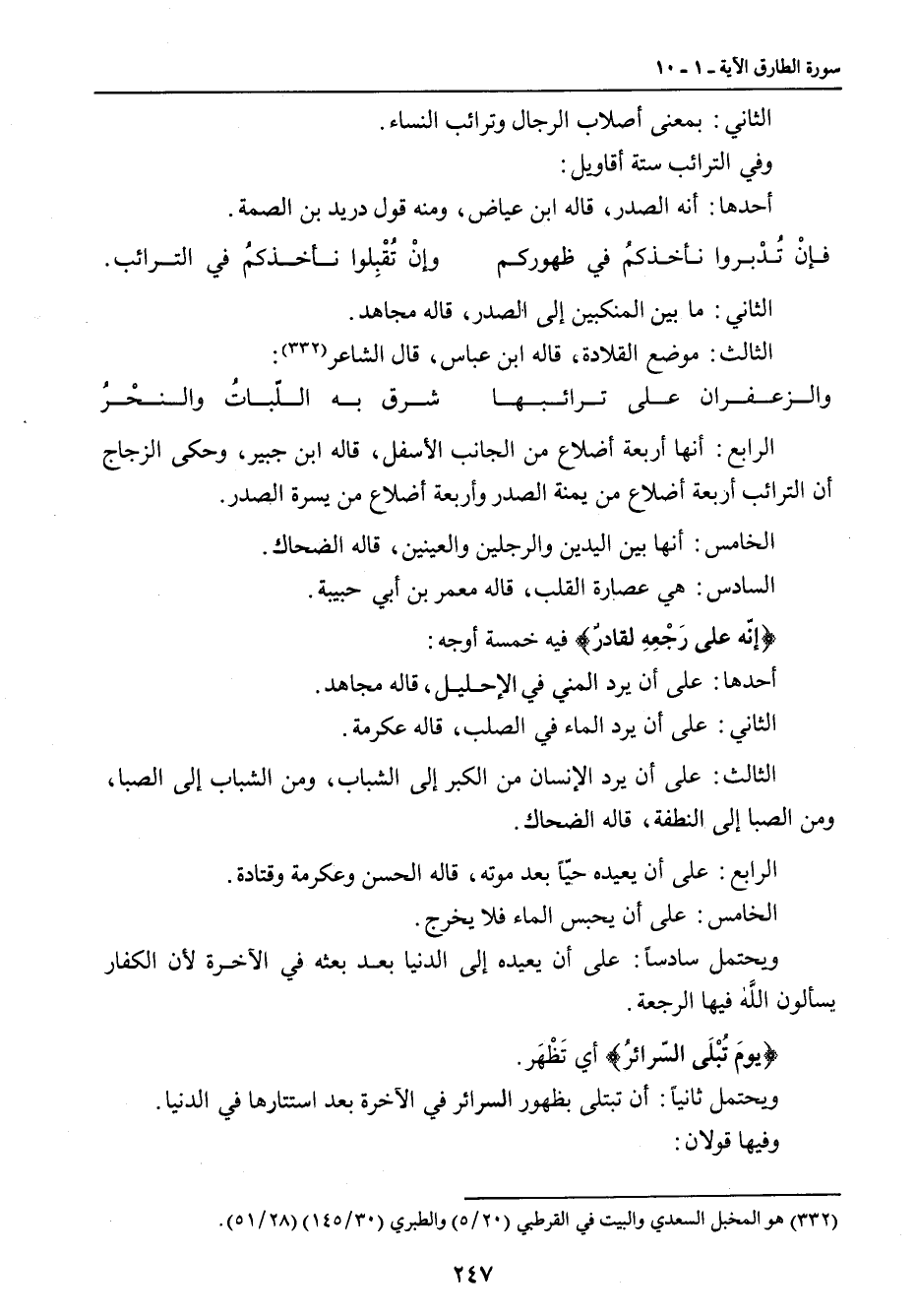 الرابع: أنها أربعة أضلاع من الجانب الأسفل , قاله ابن جبير , وحكى الزجاج أن الترائب أربعة أضلاع من يمنة الصدر وأربعة أضلاع من يسرة الصدر. الخامس: أنها بين اليدين والرجلين والعينين , قاله الضحاك. السادس: هي عصارة القلب , قاله معمر بن أبي حبيبة. {إنّه على رَجْعِهِ لقادرٌ} فيه خمسة أوجه: أحدها: على أن يرد المني في الإحليل , قاله مجاهد. الثاني: على أن يرد الماء في الصلب , قاله عكرمة. الثالث: على أن يرد الإنسان من الكبر إلى الشباب , ومن الشباب إلى الصبا , ومن الصبا إلى النطفة , قاله الضحاك. الرابع: على أن يعيده حيّاً بعد موته , قاله الحسن وعكرمة وقتادة. الخامس: على أن يحبس الماء فلا يخرج. ويحتمل سادساً: على أن يعيده إلى الدنيا بعد بعثه في الآخرة لأن الكفار يسألون الله فيها الرجعة. {يومَ تُبْلَى السّرائرُ} أي تَظْهَر. ويحتمل ثانياً: أن تبتلى بظهور السرائر في الآخرة بعد استتارها في الدنيا.