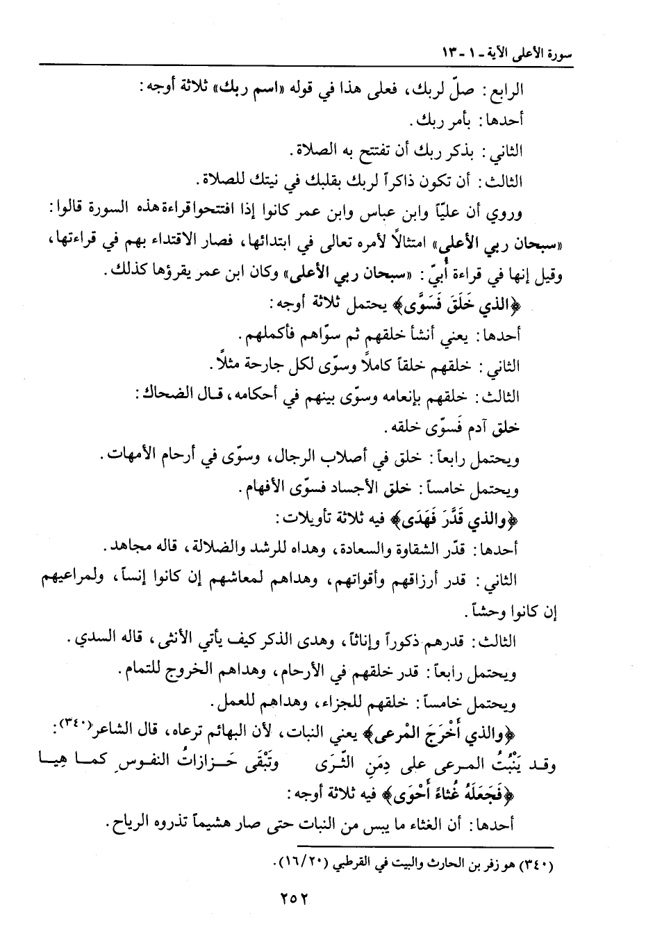 الرابع: صلّ لربك , فعلى هذا في قوله (اسم ربك) ثلاثة أوجه: أحدها: بأمر ربك. الثاني: بذكر ربك أن تفتتح به الصلاة. الثالث: أن تكون ذاكراً لربك بقلبك في نيتك للصلاة. وروي أن عليّاً وابن عباس وابن عمر كانوا إذا افتتحوا قراءة هذه السورة قالوا: (سبحان ربي الأعلى) امتثالاً لأمره تعالى في ابتدائها , فصار الاقتداء بهم في قراءتها , وقيل إنها في قراءة أُبيّ: (سبحان ربي الأعلى) وكان ابن عمر يقرؤها كذلك. {الذي خَلَقَ فَسَوَّى} يحتمل ثلاثة أوجه: أحدها: يعني أنشأ خلقهم ثم سوّاهم فأكملهم. الثاني: خلقهم خلقاً كاملاً وسوّى لكل جارحة مثلاً. الثالث: خلقهم بإنعامه وسوّى بينهم في أحكامه , قال الضحاك: خلق آدم فَسوّى خلقه. ويحتمل رابعاَ: خلق في أصلاب الرجال , وسوّى في أرحام الأمهات. ويحتمل خامساً: خلق الأجساد فسّوى الأفهام. {والذي قَدَّرَ فَهَدَى} فيه ثلاثة تأويلات: أحدها: قدّر الشقاوة والسعادة , وهداه للرشد والضلالة , قاله مجاهد. الثاني: قدر أرزاقهم وأقواتهم , وهداهم لمعاشهم إن كانوا إنساً , ولمراعيهم إن كانوا وحشاً. الثالث: قدرهم ذكوراً وإناثاً , وهدى الذكر كيف يأتى الأنثى , قاله السدي. ويحتمل رابعاً: قدر خلقهم في الأرحام , وهداهم الخروج للتمام. ويحتمل خامساً: خلقهم للجزاء , وهداهم للعمل. {والذي أَخْرَجَ المْرعى} يعني النبات , لأن البهائم ترعاه , قال الشاعر: