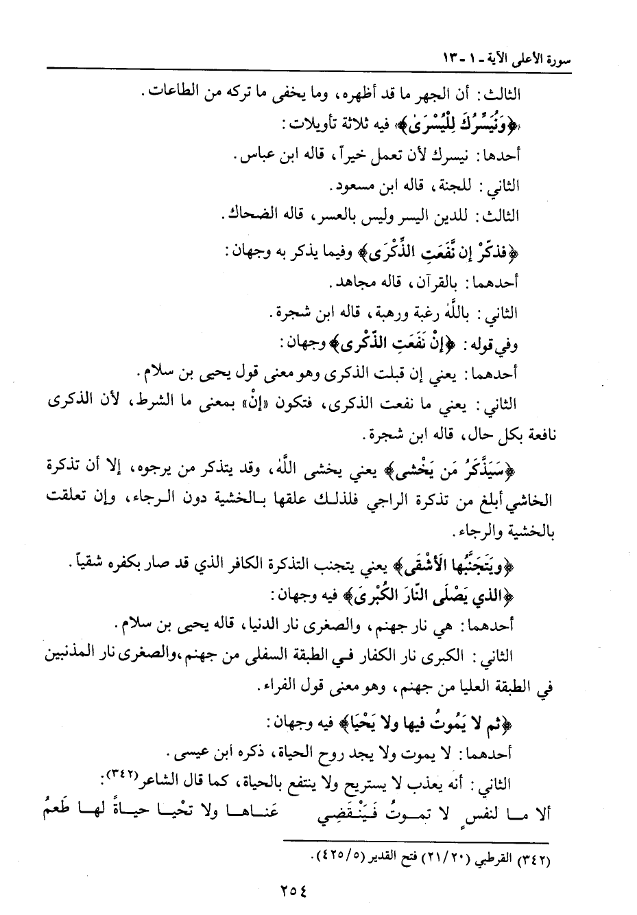 الثالث: أن الجهر ما قد أظهره , وما يخفى ما تركه من الطاعات. {وَنُيَسِّرُكَ لِلْيُسْرَى} فيه ثلاثة تأويلات: أحدها: نيسرك لأن تعمل خيراً , قاله ابن عباس. الثاني: للجنة , قاله ابن مسعود. الثالث: للدين واليسر وليس بالعسر , قاله الضحاك. {فذكّرْ إن نَّفَعتِ الذِّكْرَى} وفيما يذكر به وجهان: أحدهما: بالقرآن , قاله مجاهد. الثاني: بالله رغبة ورهبة , قاله ابن شجرة. وفي قوله: {إنْ نَفَعَتِ الذّكْرى} وجهان: أحدهما: يعني إن قبلت الذكرى وهو معنى قول يحيى بن سلام. الثاني: يعني ما نفعت الذكرى , فتكون (إنْ) بمعنى ما الشرط , لأن الذكرى نافعة بكل حال , قاله ابن شجرة. {سَيّذَّكَرُ مَن يَخْشى} يعني يخشى الله , وقد يتذكر من يرجوه , إلا أن تذكرة الخاشي أبلغ من تذكرة الراجي فلذلك علقها بالخشية دون الرجاء , وإن تعلقت بالخشية والرجاء. {وَيَتَجَنَّبُها الأشْقَى} يعني يتجنب التذكرة الكافر الذي قد صار بكفره شقياً. {الذي يَصْلَى النّارَ الكُبْرىَ} فيه وجهان: أحدهما: هي نار جهنم , والصغرى نار الدنيا , قاله يحيى بن سلام. الثاني: الكبرى نار الكفار في الطبقة السفلى من جهنم , والصغرى نار المذنبين في الطبقة العليا من جهنم , وهو معنى قول الفراء. {ثم لا يَمُوتُ فيها ولا يَحْيَا} فيه وجهان: أحدهما: لا يموت ولا يجد روح الحياة , ذكره ابن عيسى. الثاني: أنه يعذب لا يستريح ولا ينتفع بالحياة , كما قال الشاعر:
