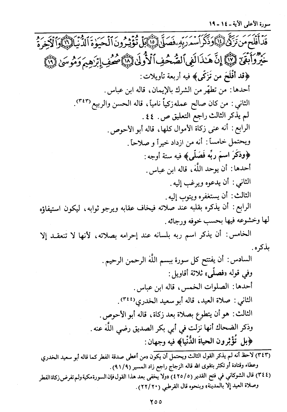 {قد أفلح من تزكى وذكر اسم ربه فصلى بل تؤثرون الحياة الدنيا والآخرة خير وأبقى إن هذا لفي الصحف الأولى صحف إبراهيم وموسى} {قد أفْلَحَ من تَزَكّى} فيه أربعة تأويلات: أحدها: من تطهّر من الشرك بالإيمان , قاله ابن عباس. الثاني: من كان صالح عمله زكياً نامياً , قاله الحسن والربيع. لم يذكر الثالث راجع التعليق ص. 44. الرابع: أنه عنى زكاة الأموال كلها , قاله أبو الأحوص. ويحتمل خامساً: أنه من ازداد خيراً وصلاحاً. {وذكَرَ اسمَ ربِّه فَصَلّى} فيه ستة أوجه: أحدها: أن يوحد الله , قاله ابن عباس. الثاني: أن يدعوه ويرغب إليه. الثالث: أن يستغفروه ويتوب إليه. الرابع: أن يذكره بقلبه عند صلاته فيخاف عقابه ويرجو ثوابه , ليكون استيفاؤه لها وخشوعه فيها بحسب خوفه ورجائه. الخامس: أن يذكر اسم ربه بلسانه عند إحرامه بصلاته , لأنها لا تنعقد إلا بذكره. السادس: أن يفتتح كل سورة ببسم الله الرحمن الرحيم. وفي قوله (فصلّى) ثلاثة أقاويل: أحدها: الصلوات الخمس , قاله ابن عباس. الثاني: صلاة العيد , قاله أبو سعيد الخدري. الثالث: هو أن يتطوع بصلاة بعد زكاة , قاله أبو الأحوص. وذكر الضحاك أنها نزلت في أبي بكر الصديق رضي الله عنه. {بل تُؤْثرون الحياةَ الدُّنْيا} فيه وجهان: