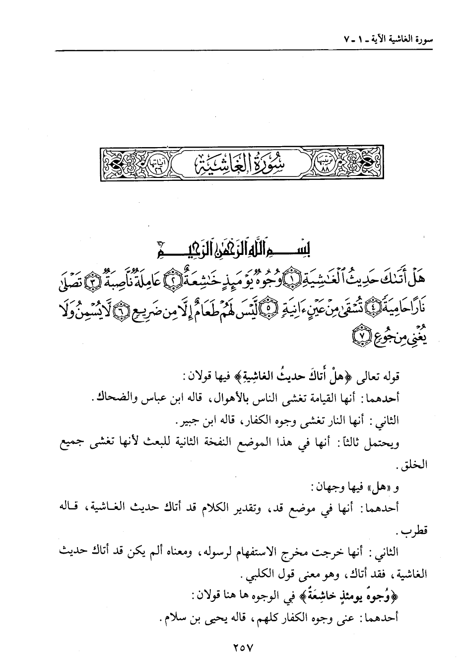 {هل أتاك حديث الغاشية وجوه يومئذ خاشعة عاملة ناصبة تصلى نارا حامية تسقى من عين آنية ليس لهم طعام إلا من ضريع لا يسمن ولا يغني من جوع} قوله تعالى {هلْ أتاكَ حديثُ الغاشِيةِ} فيها قولان: أحدهما أنها القيامة تغشى الناس بالأهوال، قاله ابن عباس والضحاك. الثاني: أنها النار تغشى وجوه الكفار، قاله ابن جبير. ويحتمل ثالثاً: أنها في هذا الموضع النفخة الثانية للبعث لأنها تغشى جميع الخلق. و (هل) فيها وجهان: أحدهما: أنها في موضع قد , وتقدير الكلام قد أتاك حديث الغاشية، قاله قطرب. الثاني: أنها خرجت مخرج الاستفهام لرسوله، ومعناه ألم يكن قد أتاك حديث الغاشية، فقد أتاك، وهو معنى قول الكلبي. {وُجوهٌ يومئذٍ خاشِعَةٌ} في الوجوه ها هنا قولان: أحدهما: عنى وجوه الكفار كلهم , قاله يحيى بن سلام.