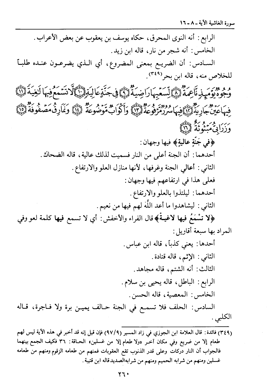 {وجوه يومئذ ناعمة لسعيها راضية في جنة عالية لا تسمع فيها لاغية فيها عين جارية فيها سرر مرفوعة وأكواب موضوعة ونمارق مصفوفة وزرابي مبثوثة} {في جَنّةٍ عاليةٍ} فيها وجهان: أحدهما: أن الجنة أعلى من النار فسميت لذلك عالية , قاله الضحاك. الثاني: أعالي الجنة وغرقها , لأنها منازل العلو والارتفاع. فعلى هذا في ارتفاعهم فيها وجهان: أحدهما: ليلتذوا بالعو والارتفاع. الثاني: ليشاهدوا ما أعد الله لهم فيها من نعيم. {لا تسْمَعُ فيها لاغيةً} قال الفراء والأخفش: أي لا تسمع فيها كلمة لغو وفي المراد بها سبعة أقاويل: أحدها: يعني كذباً , قاله ابن عباس. الثاني: الإثم , قاله قتادة. الثالث: أنه الشتم , قاله مجاهد. الرابع: الباطل , قاله يحيى بن سلام. الخامس: المعصية , قاله الحسن. السادس: الحلف فلا تسمع في الجنة حالف يمين برة ولا فاجرة , قاله الكلبي.