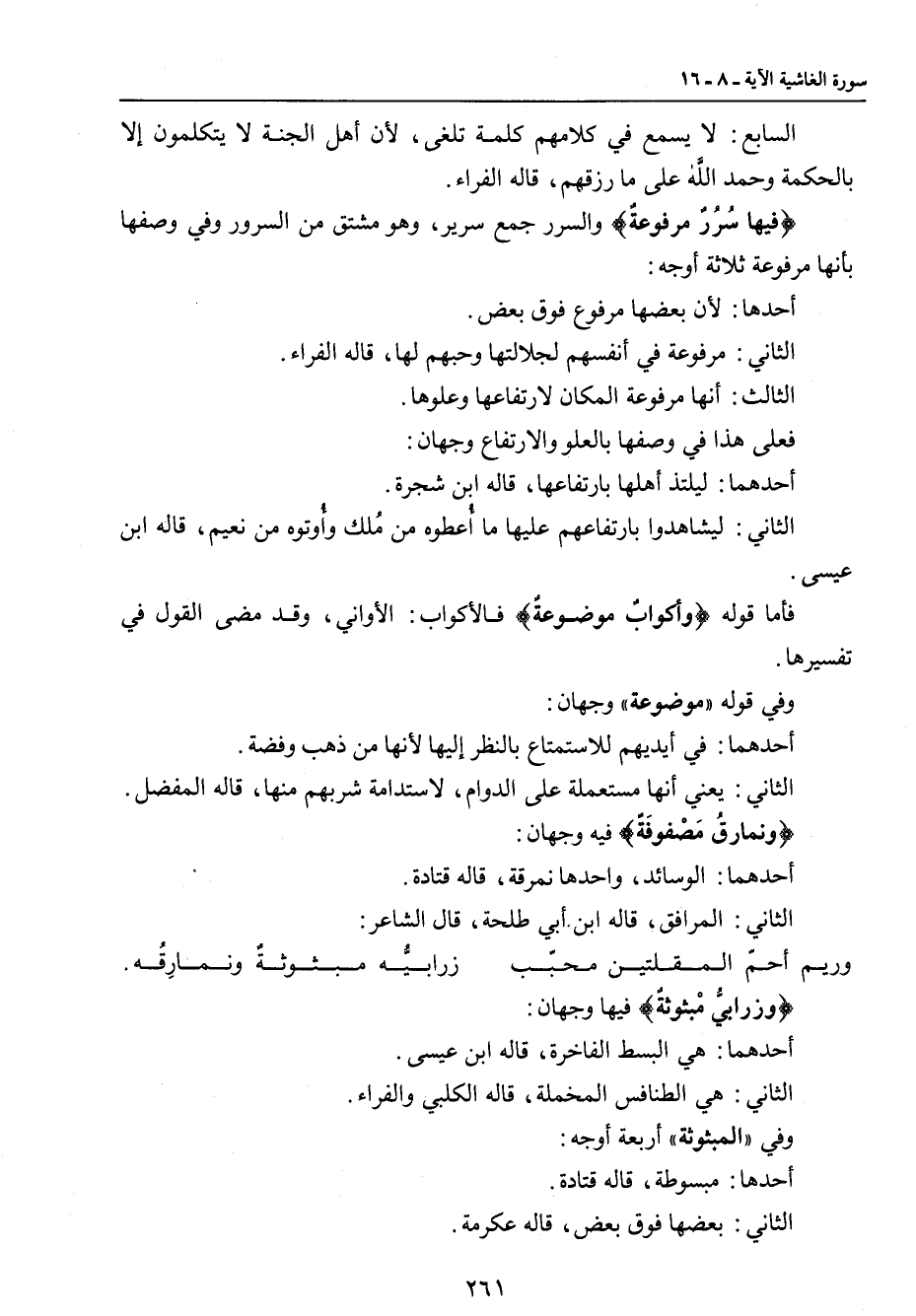 السابع: لا يسمع في كلامهم كلمة تلغى , لأن أهل الجنة لا يتكلمون إلا بالحكمة وحمد الله على ما رزقهم , قاله الفراء. {فيها سُرُرٌ مرفوعةٌ} والسرر جمع سرير , وهو مشتق من السرور وفي وصفها بأنها مرفوعة ثلاثة أوجه: أحدها: لأن بعضها مرفوع فوق بعض. الثاني: مرفوعة في أنفسهم لجلالتها وحبهم لها , قاله الفراء. الثالث: أنها مرفوعة المكان لارتفاعها وعلوها. فعلى هذا في وصفها بالعلو والارتفاع وجهان: أحدهما: ليلتذ أهلها بارتفاعها , قاله ابن شجرة. الثاني: ليشاهدوا بارتفاعهم ما أُعطوه من مُلك وأُوتوه من نعيم , قاله ابن عيسى. فأما قوله {وأكوابٌ موضوعةٌ} فالأكواب: الأواني , وقد مضى القول في تفسيرها. وفي قوله (موضوعة) وجهان: أحدهما: في أيديهم للاستمتاع بالنظر إليها لأنها من ذهب وفضة. الثاني: يعني أنها مستعملة على الدوام , لاستدامة شربهم منها , قاله المفضل. {ونمارقُ مَصْفوفَةٌ} فيه وجهان: أحدهما: الوسائد , واحدها نمرقة , قاله قتادة. الثاني: المرافق , قاله ابن أبي طلحة , قال الشاعر: