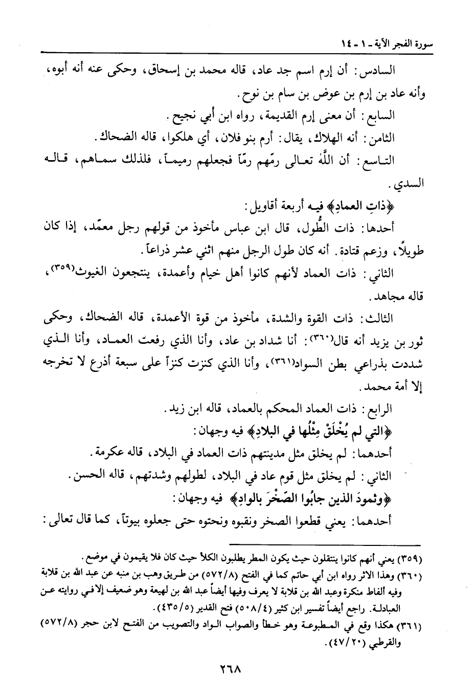السادس: أن إرم اسم جد عاد , قاله محمد بن إسحاق , وحكى عنه أنه أبوه , وأنه عاد بن إرم بن عوض بن سام بن نوح. السابع: أن معنى إرم القديمة , رواه ابن أبي نجيح. الثامن: أنه الهلاك , يقال: أرم بنو فلان , أي هلكوا , قاله الضحاك. التاسع: أن الله تعالى رمّهم رّماً فجعلهم رميماً , فلذلك سماهم , قاله السدي. {ذاتِ العمادِ} فيه أربعة أقاويل: أحدها: ذات الطُّول , قال ابن عباس مأخوذ من قولهم رجل معمّد , إذا كان طويلاً , وزعم قتادة. أنه كان طول الرجل منهم اثني عشر ذراعاً. الثاني: ذات العماد لأنهم كانوا أهل خيام وأعمدة , ينتجعون الغيوث , قاله مجاهد. الثالث: ذات القوة والشدة , مأخوذ من قوة الأعمدة , قاله الضحاك , وحكى ثور بن يزيد أنه قال: أنا شداد بن عاد , وأنا الذي رفعت العماد , وأنا الذي شددت بذراعي بطن السواد , وأنا الذي كنزت كنزاً على سبعة أذرع لا تخرجه إلا أمة محمد. الرابع: ذات العماد المحكم بالعماد , قاله ابن زيد. {التي لم يُخْلَقْ مِثْلُها في البلادِ} فيه وجهان: أحدهما: لم يخلق مثل مدينتهم ذات العماد في البلاد , قاله عكرمة. الثاني: لم يخلق مثل قوم عاد في البلاد , لطولهم وشدتهم , قاله الحسن. {وثمودَ الذين جابُوا الصّخْرَ بالوادِ} فيه وجهان: أحدهما: يعني قطعوا الصخر ونقبوه ونحتوه حتى جعلوه بيوتاً , كما قال تعالى: