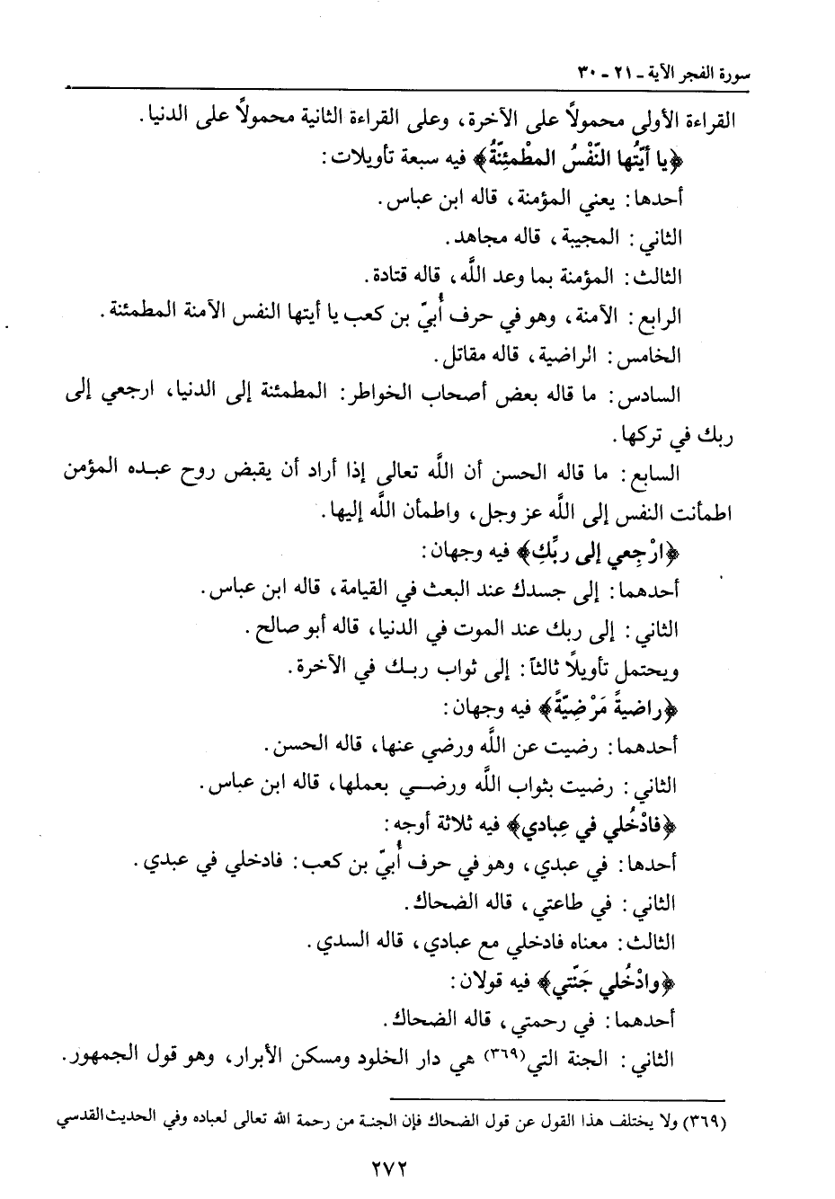 القراءة الأولى محمولاً على الآخرة , وعلى القراءة الثانية محمولاً على الدنيا. {يا أيّتُها النّفْسُ المطْمئِنّةُ} فيه سبعة تأويلات: أحدها: يعني المؤمنة , قاله ابن عباس. الثاني: المجيبة , قاله مجاهد. الثالث: المؤمنة بما وعد الله , قاله قتادة. الرابع: الآمنة , وهو في حرف أُبيّ بن كعب يا أيتها النفس الآمنة المطمئنة. الخامس: الراضية , قاله مقاتل. السادس: ما قاله بعض أصحاب الخواطر: المطمئنة إلى الدنيا , ارجعي إلى ربك في تركها. السابع: ما قاله الحسن أن الله تعالى إذا أراد أن يقبض روح عبده المؤمن اطمأنت النفس إلى الله عز وجل , واطمأن الله إليها. {ارْجِعي إلى ربِّكِ} فيه وجهان: أحدهما: إلى جسدك عند البعث في القيامة , قاله ابن عباس. الثاني: إلى ربك عند الموت في الدنيا , قاله أبو صالح. ويحتمل تأويلاً ثالثاً: إلى ثواب ربك في الآخرة. {راضيةً مَرْضِيّةً} فيه وجهان: أحدهما: رضيت عن الله ورضي عنها , قاله الحسن. الثاني: رضيت بثواب الله ورضي بعملها , قاله ابن عباس. {فادْخُلي في عِبادي} فيه ثلاثة أوجه: أحدها: في عبدي , وهو في حرف أُبيّ بن كعب: فادخلي في عبدي. الثاني: في طاعتي , قاله الضحاك. الثالث: معناه فادخلي مع عبادي , قاله السدي. {وادْخُلي جَنَتي} فيه قولان: أحدهما: في رحمتي , قاله الضحاك. الثاني: الجنة التي هي دار الخلود ومسكن الأبرار , وهو قول الجمهور.