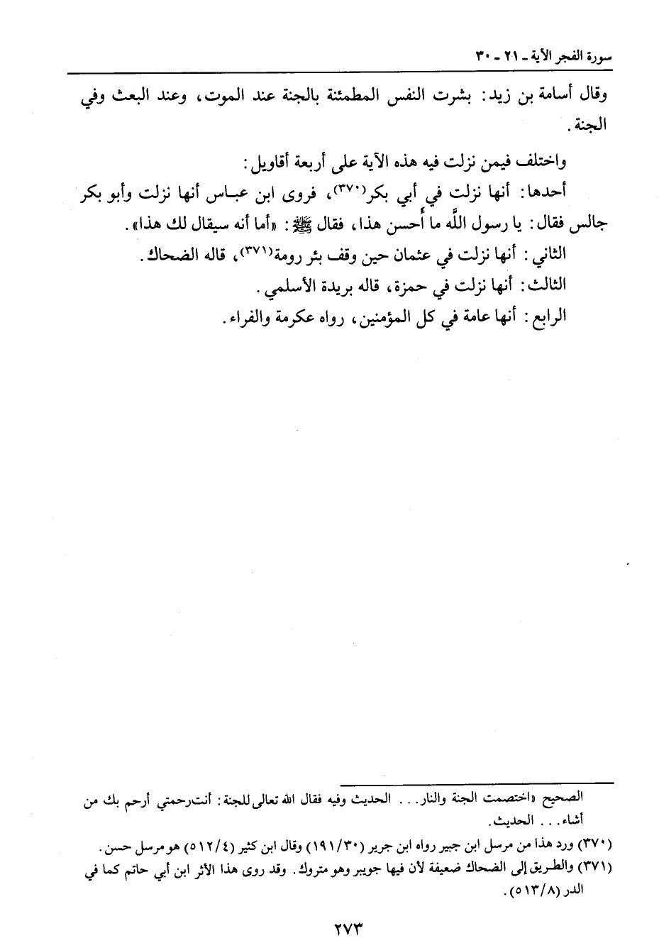 وقال أسامة بن زيد: بشرت النفس المطمئنة بالجنة عند الموت , وعند البعث وفي الجنة. واختلف فيمن نزلت فيه هذه الآية على أربعة أقاويل: أحدها: أنها نزلت في أبي بكر , فروى ابن عباس أنها نزلت وأبو بكر جالس فقال: يا رسول الله ما أَحسن هذا , فقال صلى الله عليه وسلم: (أما أنه سيقال لك هذا). الثاني: أنها نزلت في عثمان حين وقف بئر رومة , قاله الضحاك. الثالث: أنها نزلت في حمزة , قاله بريدة الأسلمي. الرابع: أنها عامة في كل المؤمنين , رواه عكرمة والفراء.