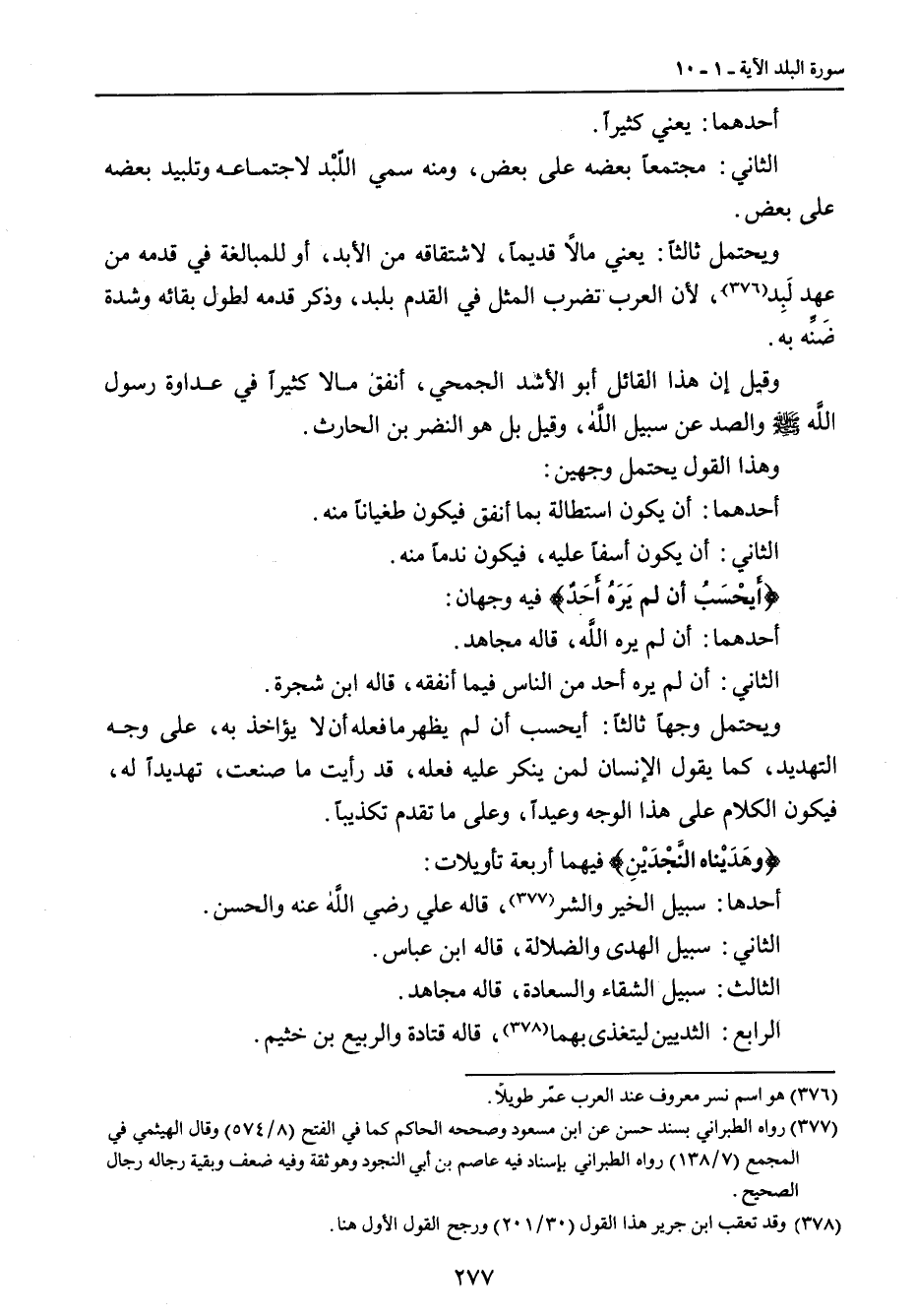 أحدهما: يعني كثيراً. الثاني: مجتمعاً بعضه على بعض , ومنه سمي اللّبْد لاجتماعه وتلبيد بعضه على بعض. ويحتمل ثالثاً: يعني مالاً قديماً , لاشتقاقه من الأبد , أو للمبالغة في قدمه من عهد لَبِد , لأن العرب تضرب المثل في القدم بلبد , وذكر قدمه لطول بقائه وشدة ضَنِّه به. وقيل إن هذا القائل أبو الشد الجمحي , أنفق مالا كثيراً في عداوة رسول الله صلى الله عليه وسلم والصد عن سبيل الله , وقيل بل هو النضر بن الحارث. وهذا القول يحتمل وجهين: أحدهما: أن يكون استطالة بما أنفق فيكون طغياناً منه. الثاني: أن يكون أسفاً عليه , فيكون ندماً منه. {أيحْسَبُ أن لم يَرَهُ أَحَدٌ} فيه وجهان: أحدهما: أن لم يره الله , قاله مجاهد. الثاني: أن لم يره أحد من الناس فيما أنفقه , قاله ابن شجرة. ويحتمل وجهاً ثالثاً: أيحسب أن لم يظهر ما فعله أن لا يؤاخذ به , على وجه التهديد , كما يقول الإنسان لمن ينكر عليه فعله , قد رأيت ما صنعت , تهديداً له فيكون الكلام على هذا الوجه وعيداً , وعلى ما تقدم تكذيباً. {وهَدَيْناه النَّجْدَيْنِ} فيهما أربعة تأويلات: أحدها: سبيل الخير والشر , قاله علي رضي الله عنه والحسن. الثاني: سبيل الهدى والضلالة , قاله ابن عباس. الثالث: سبيل الشقاء والسعادة , قاله مجاهد. الرابع: الثديين ليتغذى بهما , قاله قتادة والربيع بن خثيم.