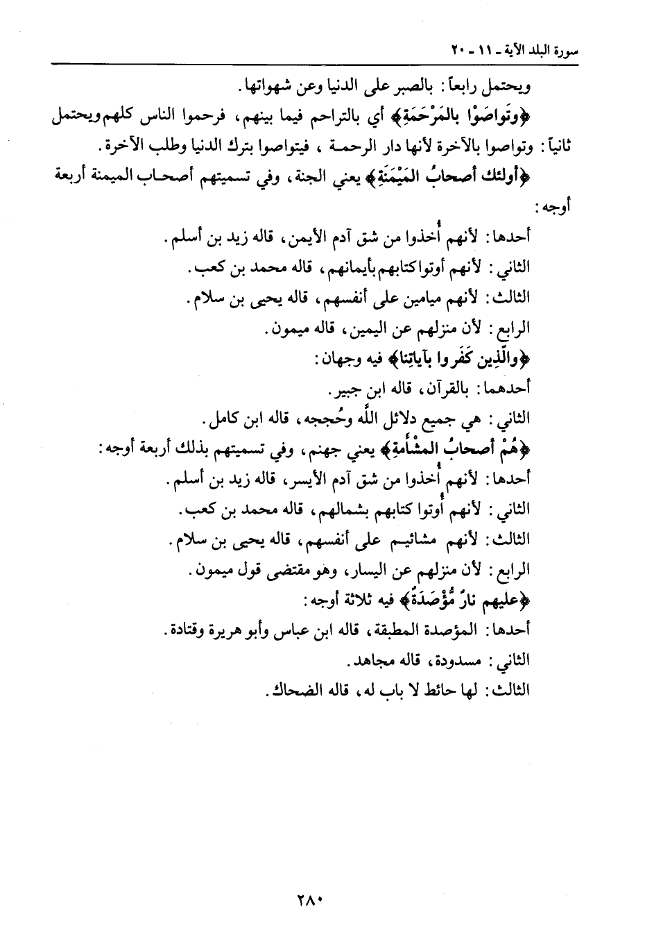 ويحتمل رابعاً: بالصبر على الدنيا وعن شهواتها. {وتَواصَوْا بالمَرْحَمَةِ} أي بالتراحم فيما بينهم , فرحموا الناس كلهم ويحتمل ثانياً: وتواصوا بالآخرة لأنها دار الرحمة , فيتواصوا بترك الدنيا وطلب الآخرة. {أولئك أصحابُ المَيْمَنَةِ} يعني الجنة , وفي تسميتهم أصحاب الميمنة أربعة أوجه: أحدها: لأنهم أُخذوا من شق آدم الأيمن , قاله زيد بن أسلم. الثاني: لأنهم أوتوا كتابهم بأيمانهم , قاله محمد بن كعب. الثالث: لأنهم ميامين على أنفسهم , قاله يحيى بن سلام. الرابع: لأنه منزلهم على اليمين , قاله ميمون. {والّذِين كَفَروا بآياتِنا} فيه وجهان: أحدهما: بالقرآن , قاله ابن جبير. الثاني: هي جميع دلائل الله وحُججه , قاله ابن كامل. {هُمْ أصحابُ المشْأَمةٍ} يعني جهنم , وفي تسميتهم بذلك أربعة أوجه: أحدها: لأنهم أُخذوا من شق آدم الأيسر , قاله زيد بن أسلم. الثاني: لأنهم أُوتوا كتابهم بشمالهم , قاله محمد بن كعب. الثالث: لأنهم مشائيم على أنفسهم , قاله يحيى بن سلام. الرابع: لأن منزلهم عن اليسار , وهو مقتضى قول ميمون. {عليهم نارٌ مُّؤصَدَةٌ} فيه ثلاثة أوجه: أحدها: المؤصدة المطبقة , قاله ابن عباس وأبو هريرة وقتادة. الثاني: مسدودة , قاله مجاهد. الثالث: لها حائط لا باب له، قاله الضحاك.