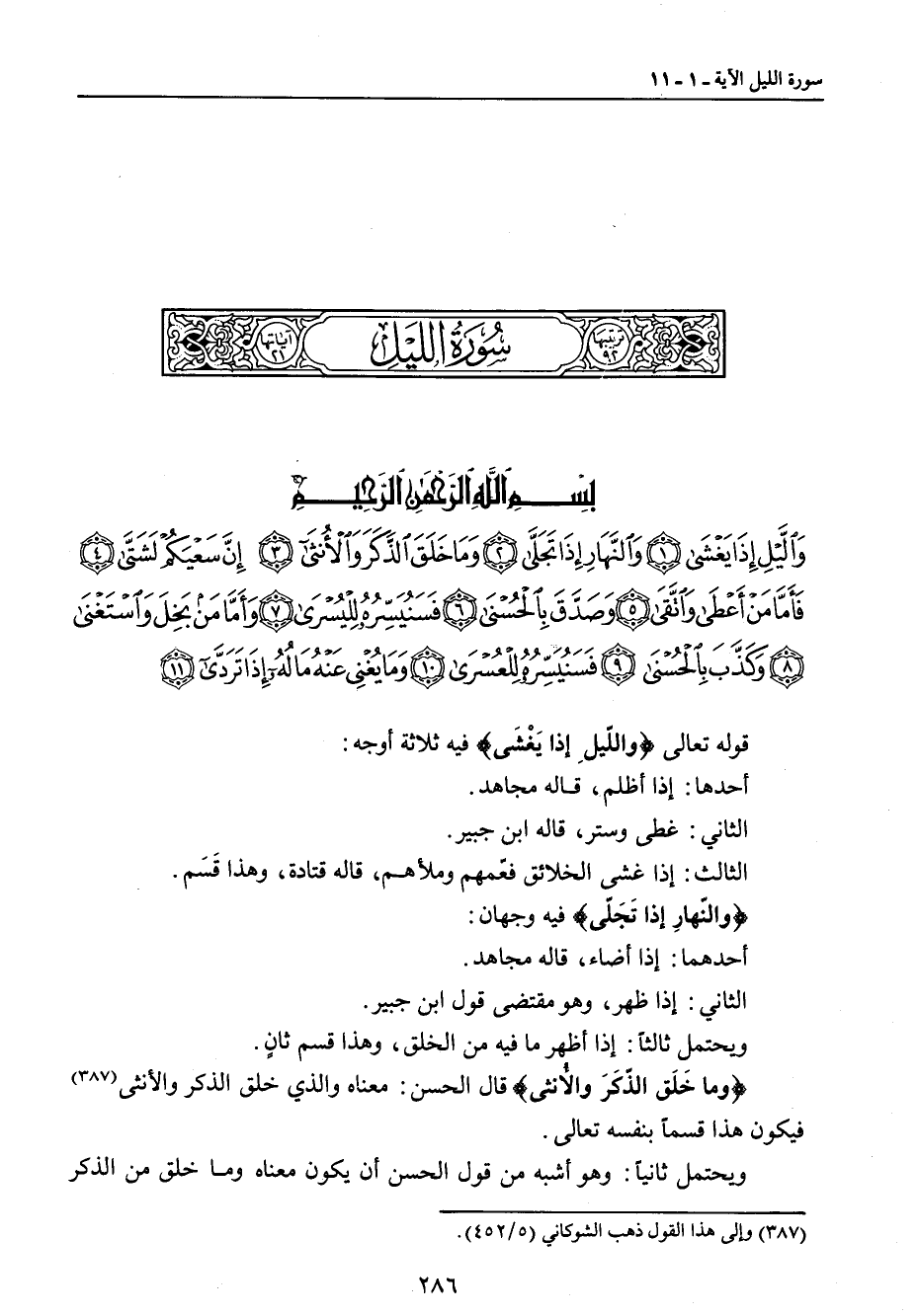 {والليل إذا يغشى والنهار إذا تجلى وما خلق الذكر والأنثى إن سعيكم لشتى فأما من أعطى واتقى وصدق بالحسنى فسنيسره لليسرى وأما من بخل واستغنى وكذب بالحسنى فسنيسره للعسرى وما يغني عنه ماله إذا تردى} قوله تعالى {واللّيلِ إذا يَغْشَى} فيه ثلاثة أوجه: أحدها: إذا أظلم , قاله مجاهد. الثاني: غطى وستر , قاله ابن جبير. الثالث: إذا غشى الخلائق فعّمهم وملأهم , قاله قتادة , وهذا قَسَم. {والنّهارِ إذا تَجَلّى} فيه وجهان: أحدهما: إذا أضاء , قاله مجاهد. الثاني: إذا ظهر , وهو مقتضى قول ابن جبير. ويحتمل ثالثاً: إذا أظهر ما فيه من الخلق , وهذا قسم ثانٍ. {وما خَلَقَ الذّكّرّ والأُنثى} قال الحسن: معناه والذي خلق الذكر والأنثى فيكون هذا قسماً بنفسه تعالى. ويحتمل ثانياً: وهو أشبه من قول الحسن أن يكون معناه وما خلق من الذكر