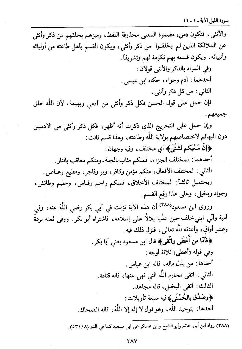 والأنثى , فتكون (من) مضمرة المعنى محذوفة اللفظ , وميزهم بخلقهم من ذكر وأنثى عن الملائكة الذين لم يخلقوا من ذكر وأنثى , ويكون القسم بأهل طاعته من أوليائه وأنبيائه , ويكون قسمه بهم تكرمة لهم وتشريفاً. وفي المراد بالذكر والأنثى قولان: أحدهما: آدم وحواء , حكاه ابن عيسى. الثاني: من كل ذكر وأنثى. فإن حمل على قول الحسن فكل ذكر وأنثى من آدمي وبهيمة , لأن الله خلق جميعهم. وإن حمل على التخريج الذي ذكرت أنه أظهر , فكل ذكر وأنثى من الآدميين دون البهائم لاختصاصهم بولاية الله وطاعته , وهذا قسم ثالث: {إنّ سَعْيَكم لشَتّى} أي مختلف , وفيه وجهان: أحدهما: لمختلف الجزاء , فمنكم مثاب بالجنة , ومنكم معاقب بالنار. الثاني: لمختلف الأفعال , منكم مؤمن وكافر , وبر وفاجر , ومطيع وعاص. ويحتمل ثالثاً: لمختلف الأخلاق , فمنكم راحم وقاس , وحليم وطائش , وجواد وبخيل , وعلى هذا وقع القسم. وروى ابن مسعود أن هذه الآية نزلت في أبي بكر رضي الله عنه , وفي أمية وأبّي ابني خلف حين عذّبا بلالاً على إسلامه , فاشتراه أبو بكر , ووفي ثمنه بردةً وعشر أوراقٍ , وأعتقه للَّه تعالى , فنزل ذلك فيه. {فأمّا من أَعْطَى واتّقَى} قال ابن مسعود يعني أبا بكر. وفي قوله (أعطى) ثلاثة أوجه: أحدها: من بذل ماله , قاله ابن عباس. الثاني: اتقى محارم الله التي نهى عنها , قال قتادة. الثالث: اتقى البخل , قاله مجاهد. {وصَدَّق بالحُسْنَى} فيه سبعة تأويلات: أحدها: بتوحيد الله , وهو قول لا إله إلا الله , قاله الضحاك.
