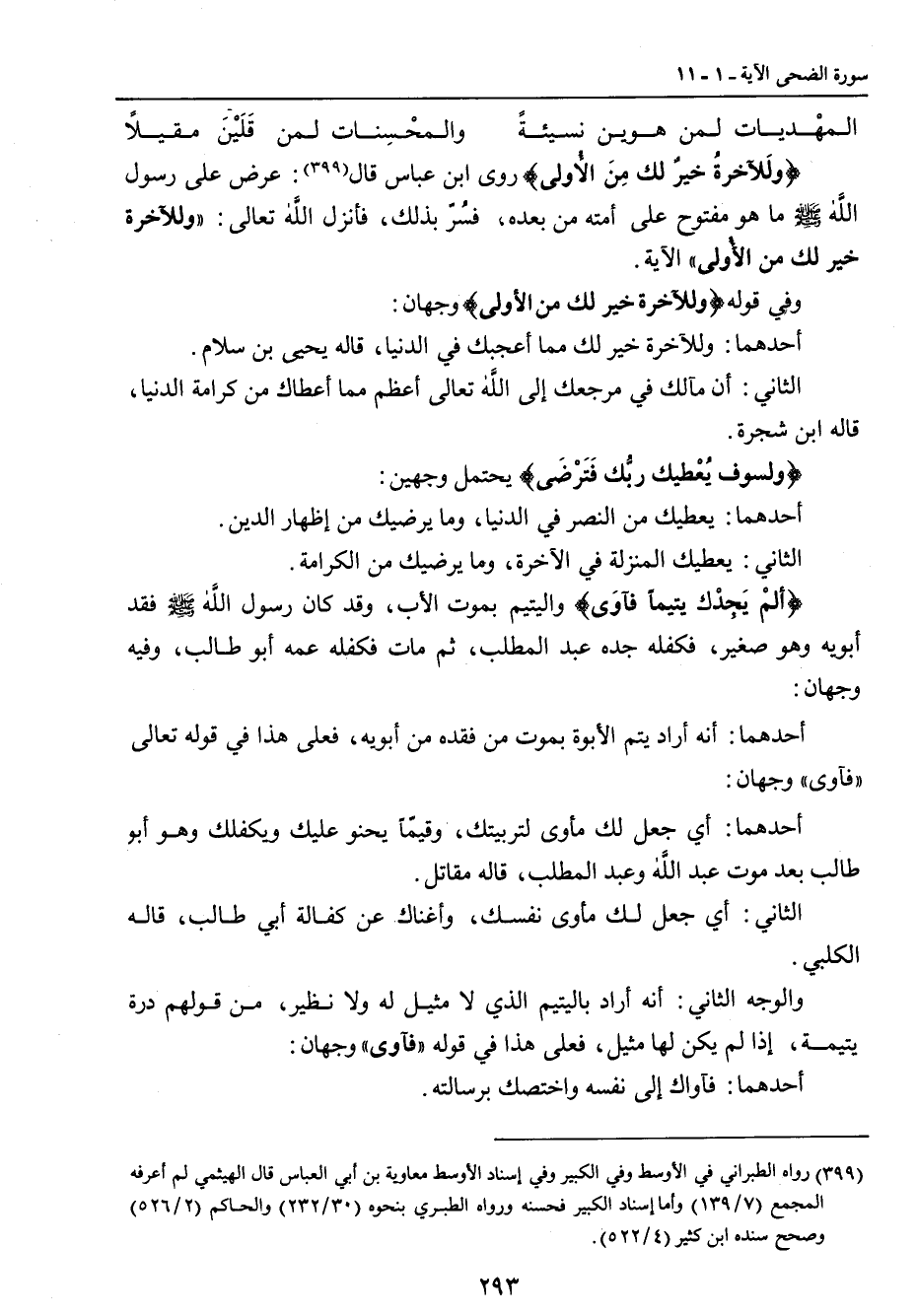 {ولَلآخرةُ خير لك مِنَ الأُولى} روى ابن عباس قال: عرض على رسول الله صلى الله عليه وسلم ما هو مفتوح على أمته من بعده، فسُرّ بذلك، فأنزل الله تعالى: (وللآخرة خير لك من الأُولى) الآية. وفي قوله {وللآخرة خير لك من الأولى} وجهان: أحدهما: وللآخرة خير لك مما أعجبك في الدنيا , قاله يحيى بن سلام. الثاني: أن مآلك في مرجعك إلى الله تعالى أعظم مما أعطاك من كرامة الدنيا , قاله ابن شجرة. {ولسوف يُعْطيك ربُّك فَتَرْضَى} يحتمل وجهين: أحدهما: يعطيك من النصر في الدنيا , وما يرضيك من إظهار الدين. الثاني: يعطيك المنزلة في الآخرة , وما يرضيك من الكرامة. {ألمْ يَجِدْك يتيماً فآوَى} واليتيم بموت الأب , وقد كان رسول الله صلى الله عليه وسلم فقد أبويه وهو صغير , فكفله جده عبد المطلب , ثم مات فكفله عمه أبو طالب , وفيه وجهان: أحدهما: أنه أراد يتم الأبوة بموت من فقده من أبويه , فعلى هذا في قوله تعالى (فآوى) وجهان: أحدهما: أي جعل لك مأوى لتربيتك , وقيمّاً يحنو عليك ويكفلك وهو أبو طالب بعد موت عبد الله وعبد المطلب , قاله مقاتل. الثاني: أي جعل لك مأوى نفسك , وأغناك عن كفالة أبي طالب , قاله الكلبي. والوجه الثاني: أنه أراد باليتيم الذي لا مثيل له ولا نظير , من قولهم درة يتيمة , إذا لم يكن لها مثيل , فعلى هذا في قوله (فآوى) وجهان: أحدهما: فآواك إلى نفسه واختصك برسالته.