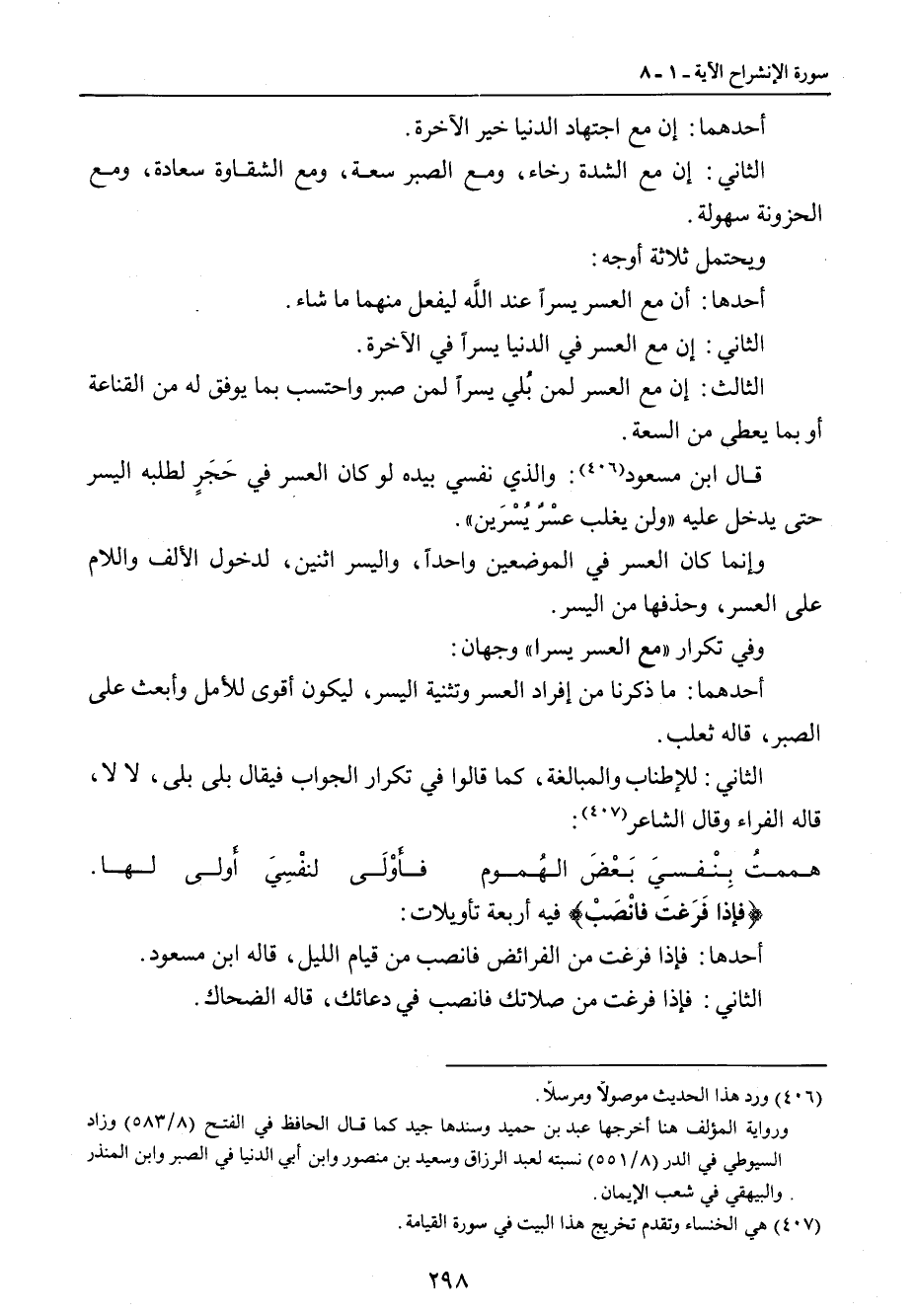 أحدهما: إن مع اجتهاد الدنيا خير الآخرة. الثاني: إن مع الشدة رخاء , ومع الصبر سعة , ومع الشقاوة سعادة , ومع الحزونة سهولة. ويحتمل ثلاثة أوجه: أحدها: أن مع العسر يسراً عند الله ليفعل منهما ما شاء. الثاني: إن مع العسر في الدنيا يسراً في الآخرة. الثالث: إن مع العسر لمن بُلي يسراً لمن صبر واحتسب بما يوفق له من القناعة أو بما يعطى من السعة. قال ابن مسعود: والذي نفسي بيده لو كان العسر في حَجَرٍ لطلبه اليسر حتى يدخل عليه (ولن يغلب عسْرٌ يُسْرَين). وإنما كان العسر في الموضعين واحداً , واليسر اثنين , لدخول الألف واللام على العسر وحذفها من اليسر. وفي تكرار (مع العسر يسرا) وجهان: أحدهما: ما ذكرنا من إفراد العسر وتثنية اليسر , ليكون أقوى للأمل وأبعث على الصبر , قاله ثعلب. الثاني: للإطناب والمبالغة , كما قالوا في تكرار الجواب فيقال بلى بلى , لا لا , قاله الفراء وقال الشاعر: