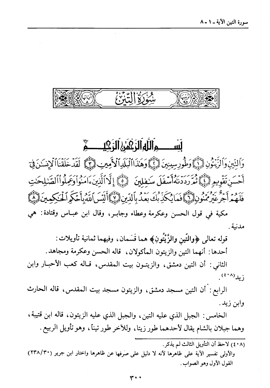 {والتين والزيتون وطور سينين وهذا البلد الأمين لقد خلقنا الإنسان في أحسن تقويم ثم رددناه أسفل سافلين إلا الذين آمنوا وعملوا الصالحات فلهم أجر غير ممنون فما يكذبك بعد بالدين أليس الله بأحكم الحاكمين} مكية في قول الحسن وعكرمة وعطاء وجابر، وقال ابن عباس وقتادة: هي مدنية. قوله تعالى {والتّينِ والزَّيْتُونِ} هما قَسَمان، وفيهما ثمانية تأويلات: أحدها: أنهما التين والزيتون المأكولان، قاله الحسن وعكرمة ومجاهد. الثاني: أن التين دمشق، والزيتون بيت المقدس، قاله كعب الأحبار وابن زيد. الرابع: أن التين مسجد دمشق، والزيتون مسجد بيت المقدس، قاله الحارث وابن زيد. الخامس: الجبل الذي عليه التين، والجبل الذي عليه الزيتون، قاله ابن قتيبة , وهما جبلان بالشام يقال لأحدهما طور زيتا، وللآخر طور تيناً، وهو تأويل الربيع.