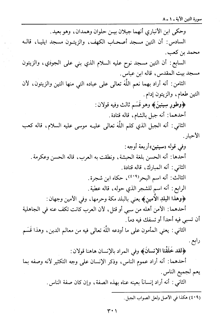 وحكى ابن الأنباري أنهما جبلان بين حلوان وهمدان , وهو بعيد. السادس: أن التين مسجد أصحاب الكهف , والزيتون مسجد ايليا , قاله محمد بن كعب. السابع: أن التين مسجد نوح عليه السلام الذي بني على الجودي , والزيتون مسجد بيت المقدس , قاله ابن عباس. الثامن: أنه أراد بهما نعم الله تعالى على عباده التي منها التين والزيتون , لأن التين طعام , والزيتون إدام. {وطورِ سِينينَ} وهو قَسَم ثالث وفيه قولان: أحدهما: أنه جبل بالشام , قاله قتادة. الثاني: أنه الجبل الذي كلم الله تعالى عليه موسى عليه السلام , قاله كعب الأحبار. وفي قوله (سينين) أربعة أوجه: أحدها: أنه الحسن بلغة الحبشة , ونطقت به العرب , قاله الحسن وعكرمة. الثاني: أنه المبارك , قاله قتادة. الثالث: أنه اسم البحر , حكاه ابن شجرة. الرابع: أنه اسم للشجر الذي حوله , قاله عطية. {وهذا البلدِ الأَمينِ} يعني بالبلد مكة وحرمها , وفي الأمين وجهان: أحدهما: الآمن أهله من سبي أو قتل , لأن العرب كانت تكف عنه في الجاهلية أن تسبي فيه أحداً أو تسفك فيه دماً. الثاني: يعني المأمون على ما أودعه الله تعالى فيه من معالم الدين , وهذا قَسَم رابع. {لقد خَلَقْنا الإنسانَ} وفي المراد بالإنسان ها هنا قولان: أحدهما: أنه أراد عموم الناس، وذكر الإنسان على وجه التكثير لأنه وصفه بما يعم لجميع الناس. الثاني: أنه أراد إنساناً بعينه عناه بهذه الصفة، وإن كان صفة الناس.
