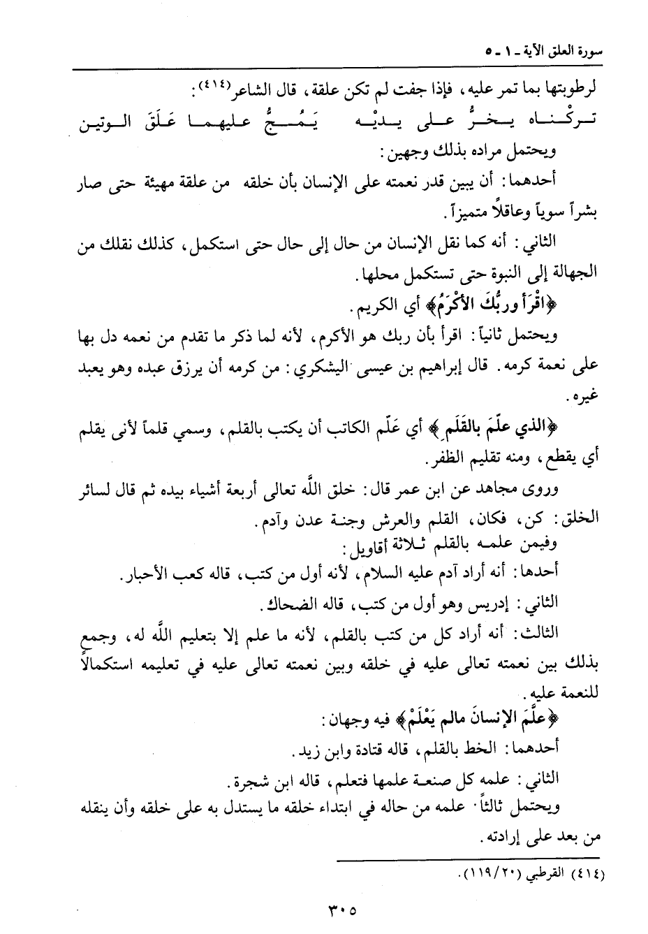 ويحتمل مراده بذلك وجهين: أحدهما: أن يبين قدر نعمته على الإنسان بأن خلقه من علقة مهيئة حتى صار بشراً سوياً وعاقلاً متميزاً. الثاني: أنه كما نقل الإنسان من حال إلى حال حتى استكمل , كذلك نقلك من الجهالة إلى النبوة حتى تستكمل محلها. {اقْرَأ وربُّكَ الأكْرَمُ} أي الكريم. ويحتمل ثانياً: اقرأ بأن ربك هو الأكرم , لأنه لما ذكر ما تقدم من نعمه دل بها على نعمة كرمه. قال إبراهيم بن عيسى اليشكري: من كرمه أن يرزق عبده وهو يعبد غيره. {الذي علّمَ بالقَلَمِ} أي عَلّم الكاتب أن يكتب بالقلم , وسمي قلماً لأنى يقلم أي يقطع , ومنه تقليم الظفر. وروى مجاهد عن ابن عمر قال: خلق الله تعالى أربعة أشياء بيده ثم قال لسائر الخلق: كن , فكان , القلم والعرش وجنة عدن وآدم. وفيمن علمه بالقلم ثلاثة أقاويل: أحدها: أنه أراد آدم عليه السلام , لأنه أول من كتب , قاله كعب الأحبار. الثاني: إدريس وهو أول من كتب , قاله الضحاك. الثالث: أنه أراد كل من كتب بالقلم لأنه ما علم إلا بتعليم الله له , وجمع بذلك بين نعمته تعالى عليه في خلقه وبين نعمته تعالى عليه في تعليمه استكمالاً للنعمة عليه. {علَّمَ الإنسانَ مالم يَعْلَمْ} فيه وجهان: أحدهما: الخط بالقلم , قاله قتادة وابن زيد. الثاني: علمه كل صنعه علمها فتعلم , قاله ابن شجرة. ويحتمل ثالثاً: علمه من حاله في ابتداء خلقه ما يستدل به على خلقه وأن ينقله من بعد على إرادته.
