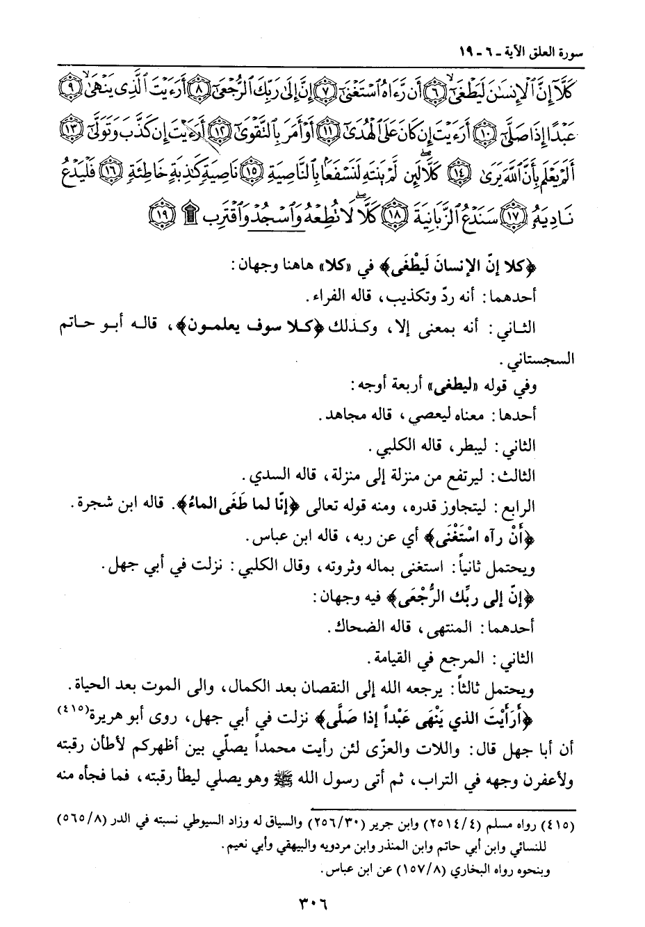 {كلا إن الإنسان ليطغى أن رآه استغنى إن إلى ربك الرجعى أرأيت الذي ينهى عبدا إذا صلى أرأيت إن كان على الهدى أو أمر بالتقوى أرأيت إن كذب وتولى ألم يعلم بأن الله يرى كلا لئن لم ينته لنسفعا بالناصية ناصية كاذبة خاطئة فليدع ناديه سندع الزبانية كلا لا تطعه واسجد واقترب} {كلا إنّ الإنسانَ لَيطْغَى} في (كلا) ها هنا وجهان: أحدهما: أنه ردّ وتكذيب , قاله الفراء. الثاني: أنه بمعنى إلا , وكذلك {كلا سوف يعلمون} , قاله أبو حاتم السجستاني. وفي قوله (ليطغى) أربعة أوجه: الثاني: ليبطر , قاله الكلبي. الثالث: ليرتفع من منزلة إلى منزلة , قاله السدي. الرابع: ليتجاوزه قدره , ومنه قوله تعالى {إنّا لما طَغَى الماءُ} قاله ابن شجرة. {أَن رآه اسْتَغْنَى} أي عن ربه , قاله ابن عباس. ويحتمل ثانياً: استغنى بماله وثروته , وقال الكلبي: نزلت في أبي جهل. {إنّ إلى ربِّك الرُّجْعَى} فيه وجهان: أحدهما: المنتهى , قاله الضحاك. الثاني: المرجع في القيامة. ويحتمل ثالثاً: يرجعه الله إلى النقصان بعد الكمال , وإلى الموت بعد الحياة. {أَرَأَيْتَ الذي يَنْهَى عَبْداً إذا صَلَّى} نزلت في أبي جهل , روى أبو هريرة أن أبا جهل قال: واللات والعزّى لئن رأيت محمداً يصلّي بين أظهركم لأطأن رقبته ولأعفرن وجهه في التراب , ثم أتى رسول الله صلى الله عليه وسلم وهو يصلي ليطأ رقبته , فما فجأه منه