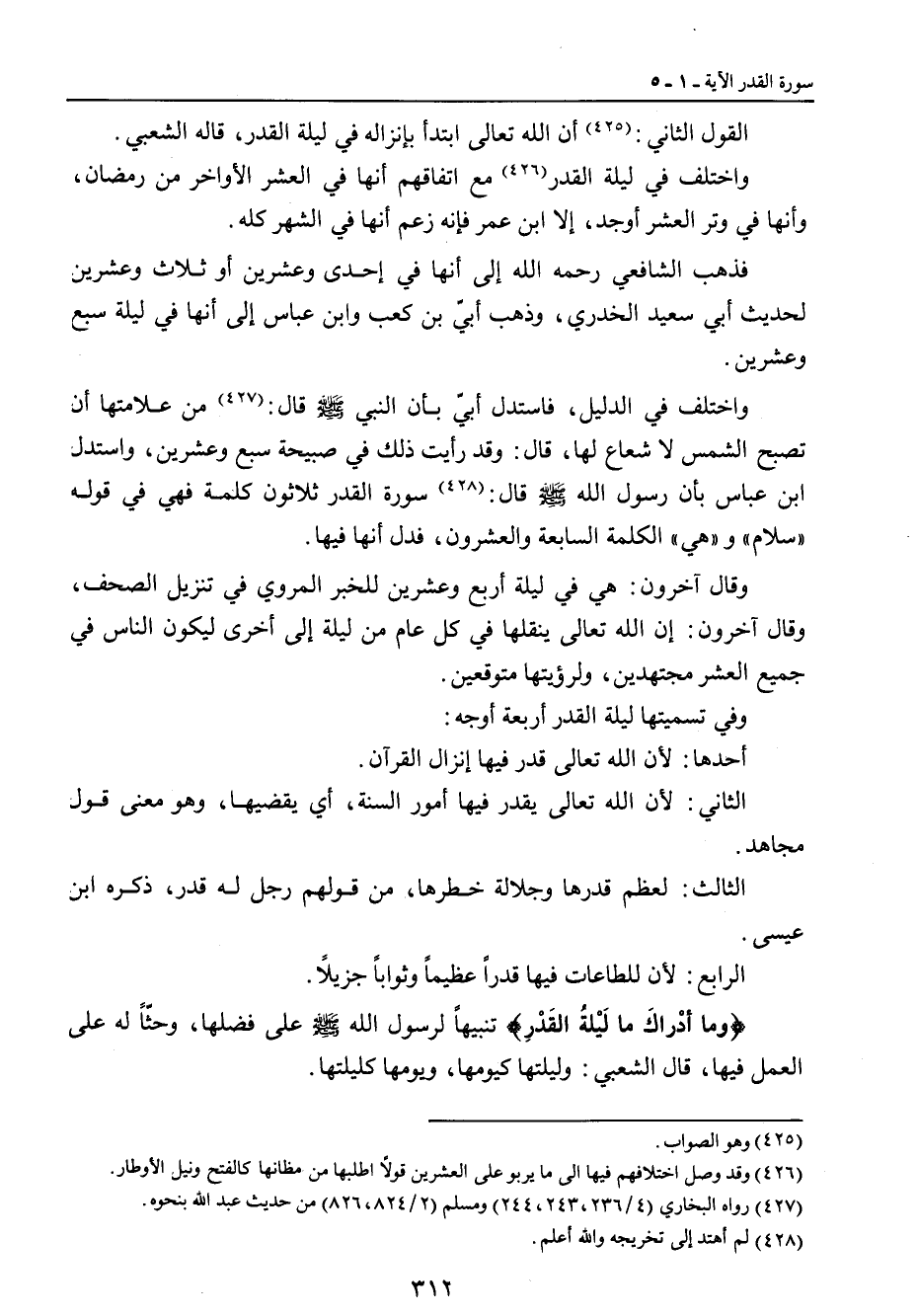 القول الثاني: أن الله تعالى ابتدأ بإنزاله في ليلة القدر , قاله الشعبي. واختلف في ليلة القدر مع اتفاقهم أنها في العشر الأواخر من رمضان , وأنها في وتر العشر أوجد , إلا ابن عمر فإنه زعم أنها في الشهر كله. فذهب الشافعي رحمه الله إلى أنها في إحدى وعشرين أو ثلاث وعشرين لحديث أبي سعيد الخدري , وذهب أبيّ بن كعب وابن عباس إلى أنها في ليلة سبع وعشرين. واختلف في الدليل , فاستدل أبيّ بأن النبي صلى الله عليه وسلم قال: (من علامتها أن تصبح الشمس لا شعاع لها ,) قال: وقد رأيت ذلك في صبيحة سبع وعشرين , واستدل ابن عباس بأن رسول الله صلى الله عليه وسلم قال: سورة القدر ثلاثون كلمة فهي في قوله (سلام) و (هي) الكلمة السابعة والعشرون , فدل أنها فيها. وقال آخرون: هي في ليلة أربع وعشرين للخبر المروي في تنزيل الصحف , وقال آخرون: إن الله تعالى ينقلها في كل عام من ليلة إلى أخرى ليكون الناس في جميع العشر مجتهدين , ولرؤيتها متوقعين. وفي تسميتها ليلة القدر أربعة أوجه: أحدها: لأن الله تعالى قدر فيها إنزال القرآن. الثاني: لأن الله تعالى يقدر فيها أمور السنة , أي يقضيها , وهو معنى قول مجاهد. الثالث: لعظم قدرها وجلالة خطرها , من قولهم رجل له قدر , ذكره ابن عيسى. الرابع: لأن للطاعات فيها قدراً عظيماً وثواباً جزيلاً. {وما أدْراكَ ما لَيْلَةُ القَدْرِ} تنبيهاً لرسول الله صلى الله عليه وسلم على فضلها , وحثّاً على العمل فياه , قال الشعبي: وليلتها كيومها , ويومها كليلتها.