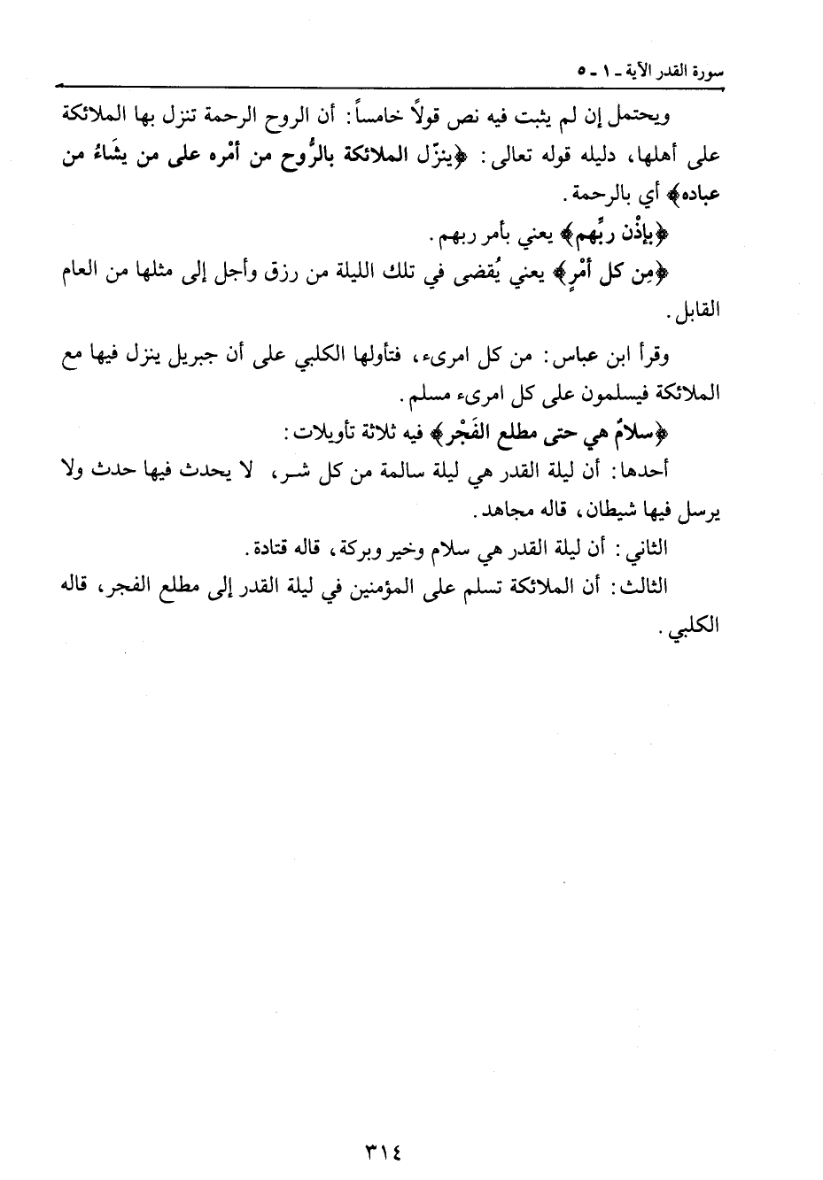 ويحتمل إن لم يثبت فيه نص قولاً خامساً: أن الروح والرحمة تنزل بها الملائكة على أهلها , دليله قوله تعالى: {ينزّل الملائكة بالرُّوح من أمْره على من يشَاءُ من عباده} أي بالرحمة. {بإذْن ربِّهم} يعني بأمر ربهم. {مِن كل أمْرٍ} يعني يُقضى في تلك الليلة من رزق وأجل إلى مثلها من العام القابل. وقرأ ابن عباس: من كل امرىء , فتأولها الكلبي على أن جبريل ينزل فيها مع الملائكة فيسلمون على كل امرىء مسلم. {سلامٌ هي حتى مطلع الفَجْر} فيه ثلاثة تأويلات: أحدها: أن ليلة القدر هي ليلة سالمة من كل شر، لا يحدث فيها حدث ولا يرسل فيها شيطان، قاله مجاهد. الثاني: أن ليلة القدر هي سلام وخير وبركة، قاله قتادة. الثالث: أن الملائكة تسلم على المؤمنين في ليلة القدر إلى مطلع الفجر، قاله الكلبي.