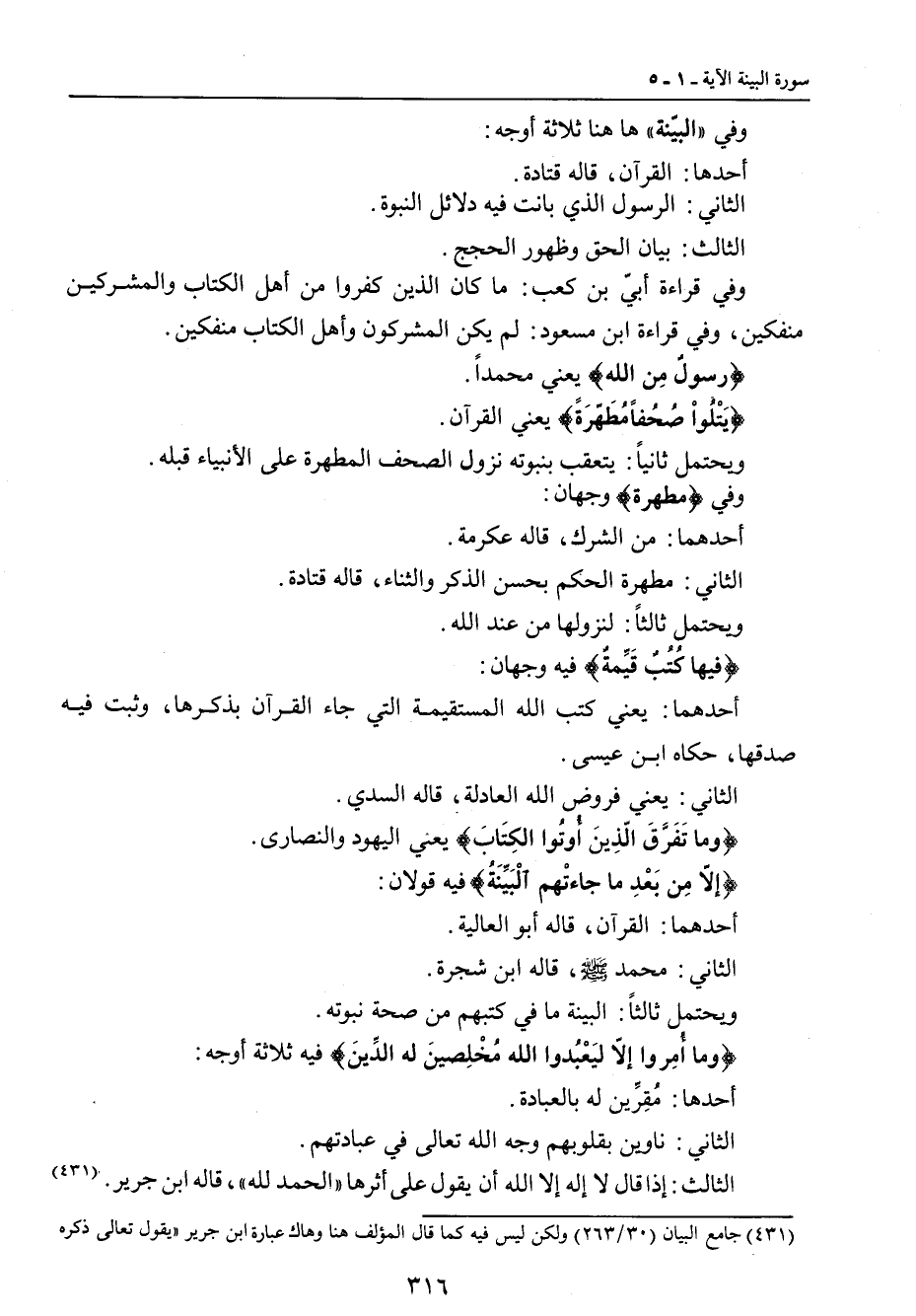 وفي (البيّنة) ها هنا ثلاثة أوجه: أحدها: القرآن، قاله قتادة. الثاني: الرسول الذي بانت فيه دلائل النبوة. الثالث: بيان الحق وظهور الحجج. وفي قراءة أبيّ بن كعب: ما كان الذي كفروا من أهل الكتاب والمشركين منفكين , وفي قراءة ابن مسعود: لم يكن المشركون وأهل الكتاب منفكين. {رسولٌ مِن الله} يعني محمداً. {يَتْلُواْ صُحُفاً مُطَهّرَةً} يعني القرآن. ويحتمل ثانياً: يتعقب بنبوته نزول الصحف المطهرة على الأنبياء قبله. وفي {مطهرة} وجهان: أحدهما: من الشرك , قاله عكرمة. الثاني: مطهرة الحكم بحسن الذكر والثناء , قاله قتادة. ويحتمل ثالثاً: لنزولها من عند الله. {فيها كُتُبٌ قَيِّمةٌ} فيه وجهان: أحدهما: يعني كتب الله المستقيمة التي جاء القرآن بذكرها , وثبت فيه صدقها , حكاه ابن عيسى. الثاني: يعني فروض الله العادلة , قاله السدي. {وما تَفَرَّقَ الّذِينَ أُوتُوا الكِتَابَ} يعني اليهود والنصارى. {إلاّ مِن بَعْدِ ما جاءتْهم البْيِّنَةُ} فيه قولان: احدهما: القرآن , قاله أبو العالية. الثاني: محمد صلى الله عليه وسلم , قاله ابن شجرة. ويحتمل ثالثاً: البينة ما في كتبهم من صحة نبوته. {وما أُمِروا إلاّ ليَعْبُدوا الله مُخْلِصينَ له الدِّينَ} فيه ثلاثة أوجه: أحدها: مُقِرِّين له بالعبادة. الثاني: ناوين بقلوبهم وجه الله تعالى في عبادتهم. الثالث: إذا قال لا إله إلا الله أن يقول على أثرها (الحمد لله)، قاله ابن جرير.