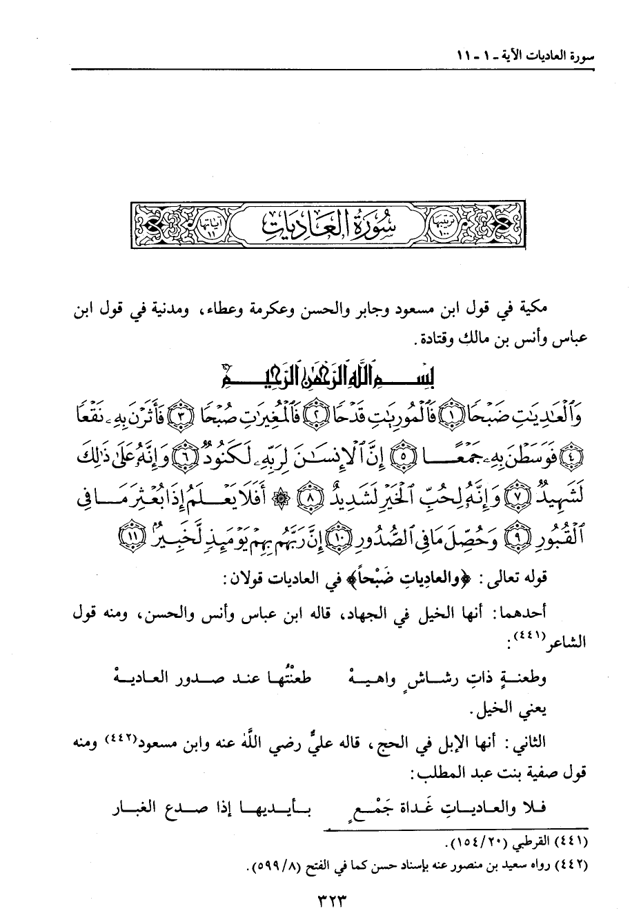 {والعاديات ضبحا فالموريات قدحا فالمغيرات صبحا فأثرن به نقعا فوسطن به جمعا إن الإنسان لربه لكنود وإنه على ذلك لشهيد وإنه لحب الخير لشديد أفلا يعلم إذا بعثر ما في القبور وحصل ما في الصدور إن ربهم بهم يومئذ لخبير} قوله تعالى: {والعادياتِ ضَبْحاً} في العاديات قولان: أحدهما: أنها الخيل في الجهاد , قاله ابن عباس وأنس والحسن , ومنه قول الشاعر: