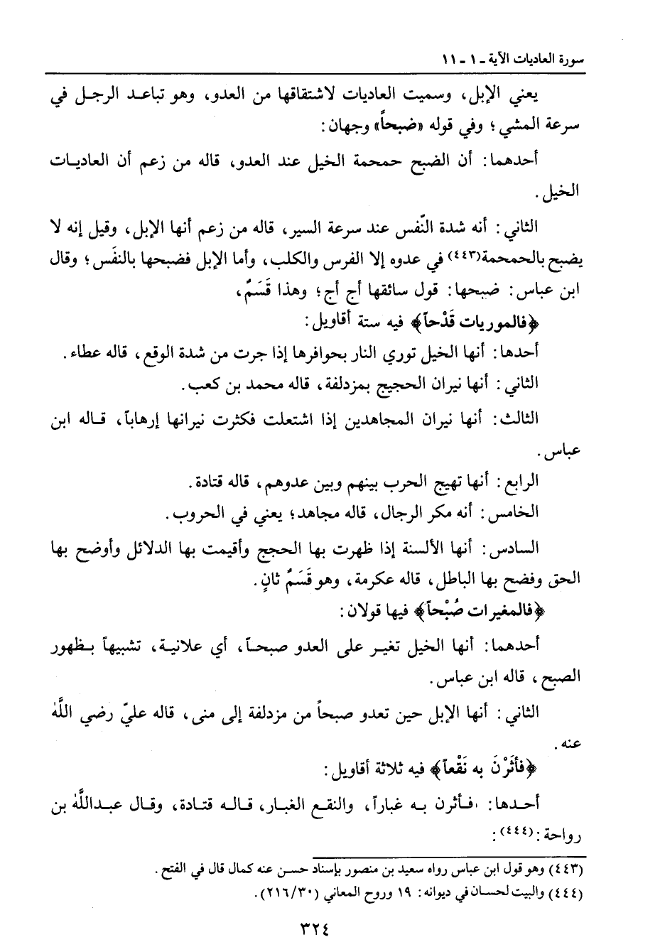 يعني الإبل , وسميت العاديات لاشتقاقها من العدو , وهو تباعد الرجل في سرعة المشي؛ وفي قوله (ضبحاً) وجهان: أحدهما: أن الضبح حمحمة الخيل عند العدو , قاله من زعم أن العاديات الخيل. الثاني: أنه شدة النّفس عند سرعة السير , قاله من زعم أنها الإبل , وقيل إنه لا يضبح بالحمحمة في عدوه إلا الفرس والكلب , وأما الإبل فضبحها بالنفَس؛ وقال ابن عباس: ضبحها: قول سائقها أج أج؛ وهذا قَسَمٌ , {فالموريات قَدْحاً} فيه ستة أقاويل: أحدها: أنها الخيل توري النار بحوافرها إذا جرت من شدة الوقع , قاله عطاء. الثاني: أنها نيران الحجيج بمزدلفة , قاله محمد بن كعب. الثالث: أنها نيران المجاهدين إذا اشتعلت فكثرت نيرانها إرهاباً , قاله ابن عباس. الرابع: أنها تهيج الحرب بينهم وبين عدوهم , قاله قتادة. الخامس: أنه مكر الرجال , قاله مجاهد؛ يعني في الحروب. السادس: أنها الألسنة إذا ظهرت بها الحجج وأقيمت بها الدلائل وأوضح بها الحق وفضح بها الباطل , قاله عكرمة , وهو قَسَمٌ ثانٍ. {فالمغيرات صُبْحاً} فيها قولان: أحدهما: أنها الخيل تغير على العدو صبحاً , أي علانية , تشبيهاً بظهور الصبح , قاله ابن عباس. الثاني: أنها الإبل حين تعدو صبحاً من مزدلفة إلى منى , قاله عليّ رضي الله عنه. {فأثَرنَ به نَقْعاً} فيه ثلاثة أقاويل: أحدها: فأثرن به غباراً , والنقع الغبار , قاله قتادة , وقال عبد الله بن رواحة: