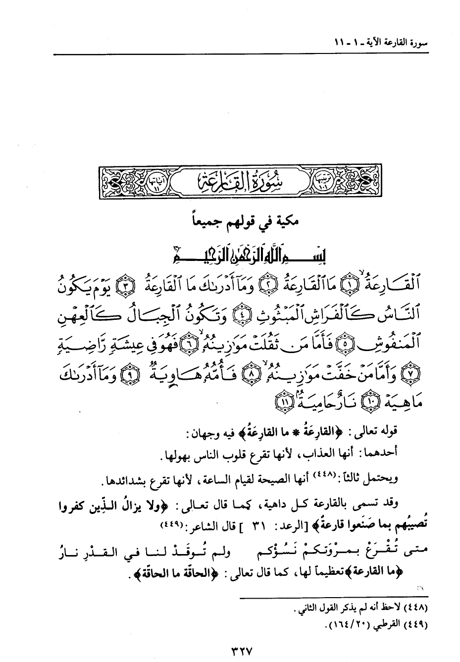 {القارعة ما القارعة وما أدراك ما القارعة يوم يكون الناس كالفراش المبثوث وتكون الجبال كالعهن المنفوش فأما من ثقلت موازينه فهو في عيشة راضية وأما من خفت موازينه فأمه هاوية وما أدراك ما هيه نار حامية} قول تعالى {القارِعَةُ ما القارِعَةُ} فيه وجهان: أحدهما: أنها العذاب , لأنها تقرع قلوب الناس بهولها. ويحتمل ثانياً: أنها الصيحة لقيام الساعة , لأنها تقرع بشدائدها. وقد تسمى بالقارعة كل داهية , كما قال تعالى: {ولا يزالُ الذِّين كفروا تُصيبُهم بما صَنَعوا قارعةٌ} [الرعد: 31] قال الشاعر:
