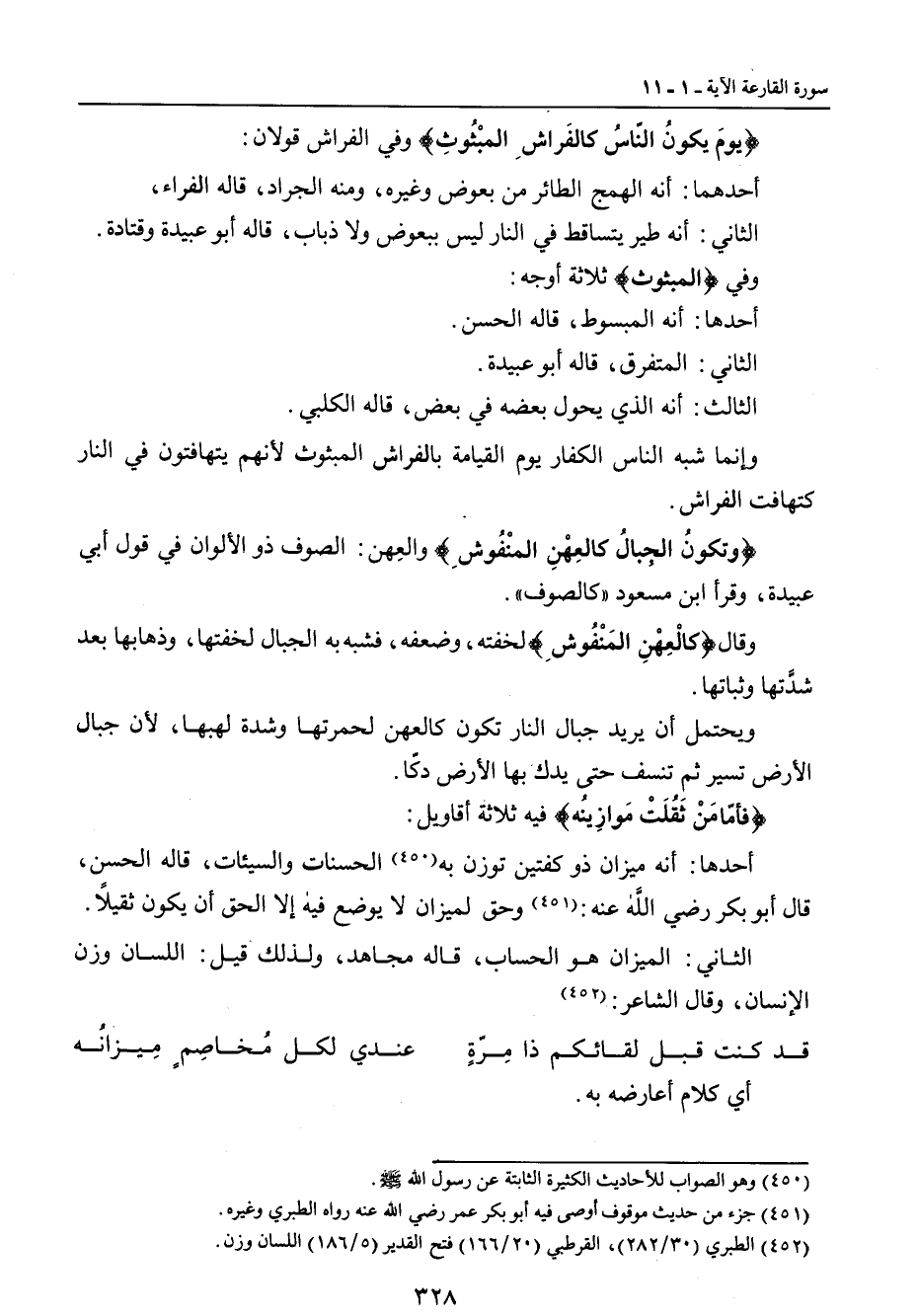 {يومَ يكونُ النّاسُ كالفَراشِ المبْثُوثِ} وفي الفراش قولان: أحدهما: أنه الهمج الطائر من بعوض وغيره , ومنه الجراد , قاله الفراء , الثاني: أنه طير يتساقط في النار ليس ببعوض ولا ذباب , قاله أبو عبيدة وقتادة. وفي {المبثوث} ثلاثة أوجه: أحدها: أنه المبسوط , قاله الحسن. الثاني: المتفرق , قاله أبو عبيدة. الثالث: أنه الذي يحول بعضه في بعض , قاله الكلبي. وإنما شبه الناس الكفار يوم القيامة بالفراش المبثوث لأنهم يتهافتون في النار كتهافت الفراش. {وتكونُ الجبالُ كالعِهْنِ المنْفُوشِ} والعِهن: الصوف ذو الألوان في قول أبي عبيدة , وقرأ ابن مسعود: (كالصوف). وقال {كالْعِهْنِ المَنْفُوشِ} لخفته , وضعفه , فشبه به الجبال لخفتها , وذهابها بعد شدَّتها وثباتها. ويحتمل أن يريد جبال النار تكون كالعهن لحمرتها وشدة لهبها , لأن جبال الأرض تسير ثم تنسف حتى يدك بها الأرض دكّا. {فأمّا مَنْ ثَقُلَتْ مَوازِينُه} فيه ثلاثة أقاويل: أحدها: أنه ميزان ذو كفتين توزن به الحسنات والسيئات , قاله الحسن , قال أبو بكر رضي الله عنه: وحق لميزان لا يوضع فيه إلا الحق أن يكون ثقيلاً. الثاني: الميزان هو الحساب , قاله مجاهد , ولذلك قيل: اللسان وزن الإنسان , وقال الشاعر: